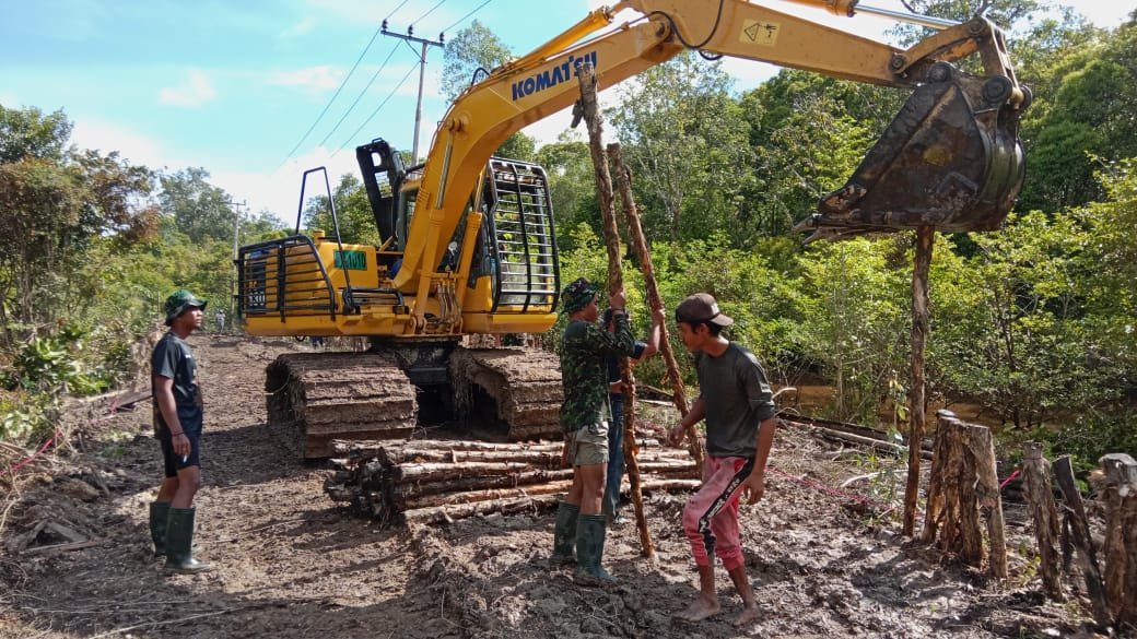 Barito Selatan – Pemasangan kayu cerucuk di sisi jalan yang menjadi sasaran pengerjaan TMMD Kodim 1012/Buntok mulai dilakukan. Teknik ini diterapkan untuk memperkuat konstruksi tanah dan menjaga kestabilan jalan yang tengah dibuka dan diperbaiki.