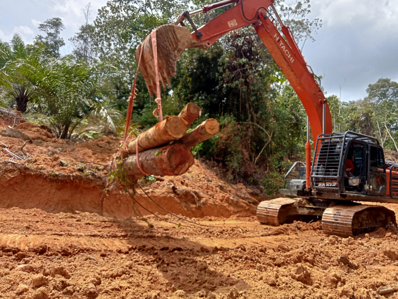 Terlihat dalam foto, alat berat mengangkat kayu-kayu glondongan yang kemudian disusun di badan jalan. Kayu tersebut dipersiapkan sebagai pondasi awal sebelum dilakukan penimbunan tanah.