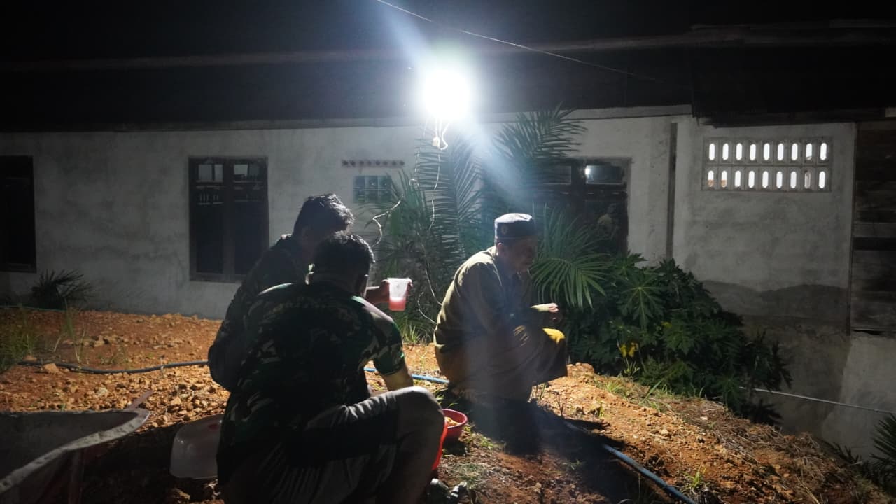 Kotawaringin Timur – Kegiatan TMMD Reguler ke-127 Kodim 1015/Sampit di Desa Tri Buana, Kecamatan Telaga Antang, menunjukkan suasana yang penuh keakraban antara anggota TNI dan masyarakat. Pada Sabtu malam, 7 Maret 2026, di sela-sela aktivitas pembuatan sumur bor, para prajurit tampak duduk santai sambil menikmati kopi dan gorengan bersama warga.