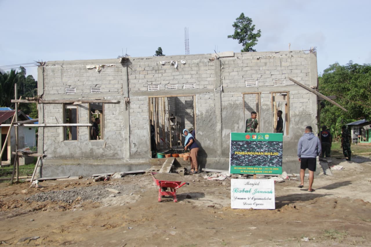 Tolitoli – Pembangunan masjid di Dusun Ogomolobu, Desa Oyom, Kecamatan Lampasio, Kabupaten Tolitoli, berlangsung dengan semangat kebersamaan dan gotong royong dalam kegiatan TMMD ke-127 pada Senin (23/2/2026). Anggota Satgas TMMD dari Kodim 1305/BT berkolaborasi dengan masyarakat setempat dalam berbagai tahap pembangunan, mulai dari pengangkutan material hingga pengerjaan struktur bangunan.