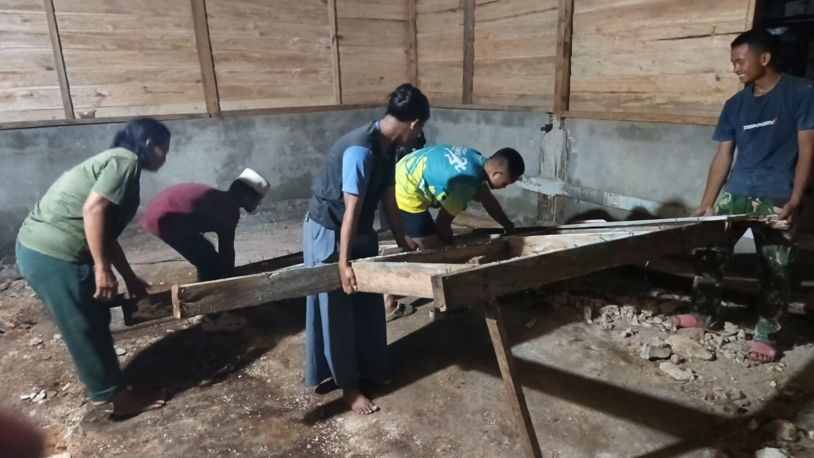 Dengan bantuan penerangan dari lampu sederhana, warga dan prajurit TNI bekerja sama dalam menyelesaikan berbagai aktivitas konstruksi, mulai dari penyusunan bata hingga pemasangan material bangunan lainnya.