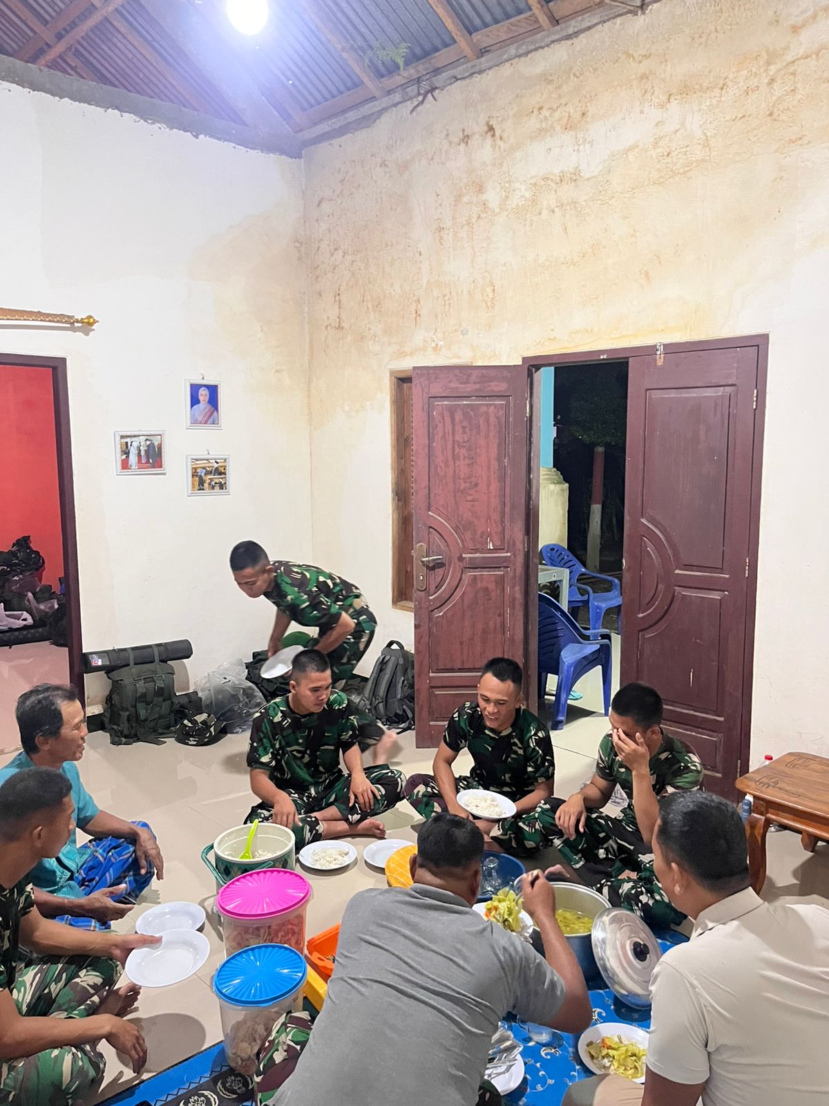 Suasana hangat dan penuh kedekatan tampak saat anggota Satgas dan keluarga tuan rumah saling duduk menikmati hidangan sederhana. Kegiatan tersebut tidak hanya berfungsi sebagai waktu istirahat setelah menjalankan tugas pembangunan, tetapi juga sebagai sarana untuk berkomunikasi antara anggota Satgas dan masyarakat setempat. Pada kesempatan itu, anggota Satgas sering berdiskusi mengenai kehidupan sehari-hari warga dan kemajuan pelaksanaan program TMMD.