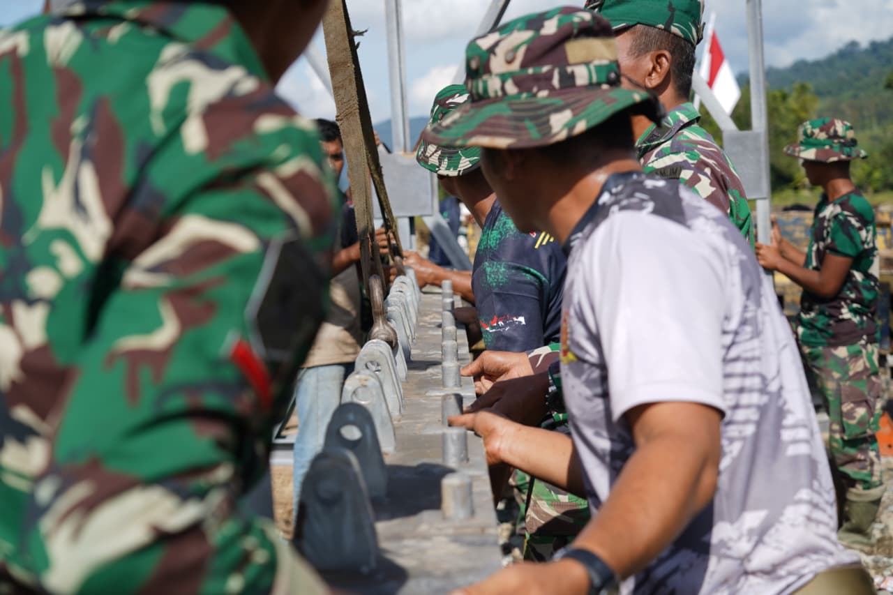 Meski di bawah terik panas matahari, proses perakitan jembatan tetap berjalan lancar. Kondisi tersebut tidak menyurutkan semangat para prajurit dan unsur terkait untuk segera mengembalikan akses vital bagi mobilitas masyarakat.