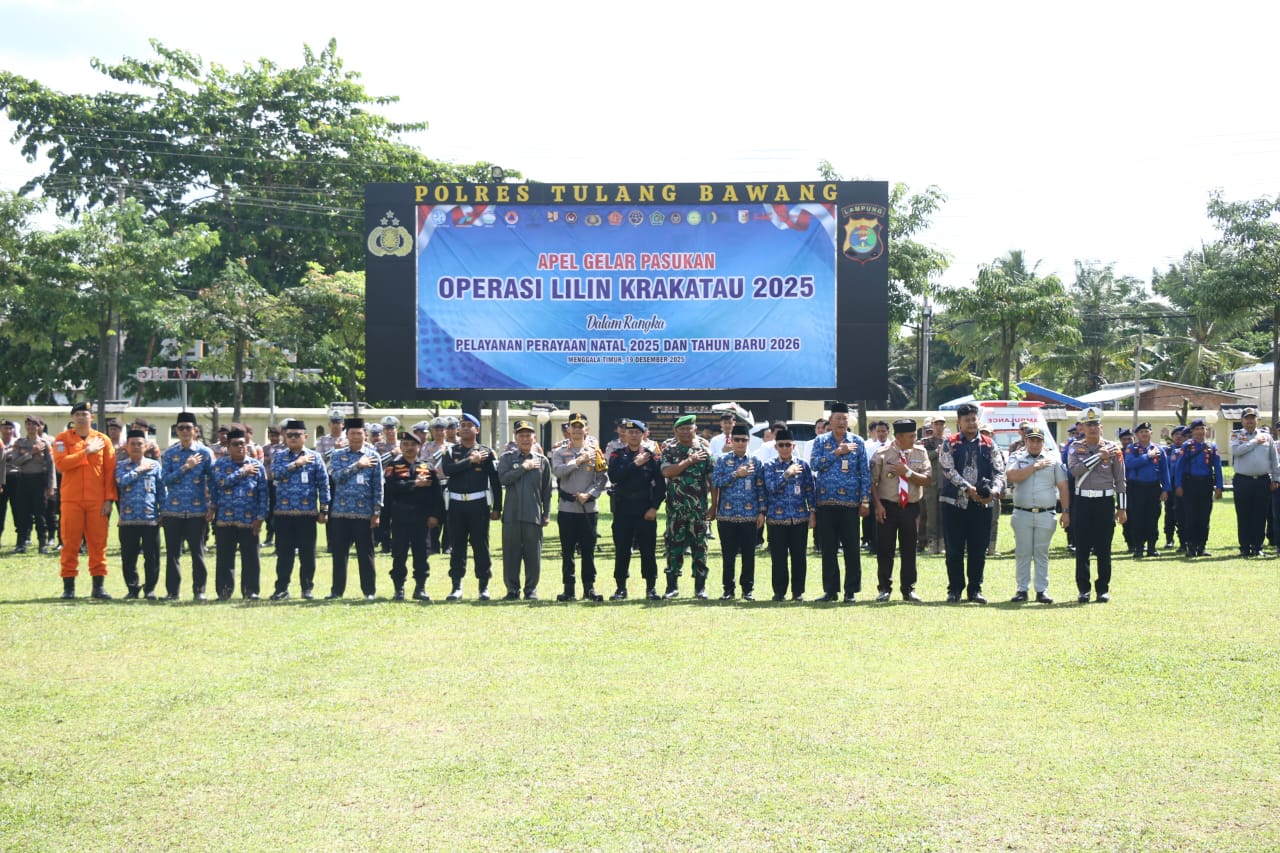Menggala Timur, Tulang Bawang – Pada Jumat, 19 Desember 2025, Kodim 0426/Tulang Bawang melaksanakan Apel Gelar Pasukan untuk Operasi Lilin Krakatau Tahun Anggaran 2025. Kegiatan ini bertujuan untuk mengamankan perayaan Natal 2025 serta Tahun Baru 2026 di wilayah Kabupaten Tulang Bawang. Apel yang diadakan di Mapolres Tulang Bawang, Jalan Lintas Timur Sumatera KM 13, Kelurahan Lebuh Dalam, Kecamatan Menggala Timur, dihadiri oleh berbagai pejabat daerah dan instansi terkait.