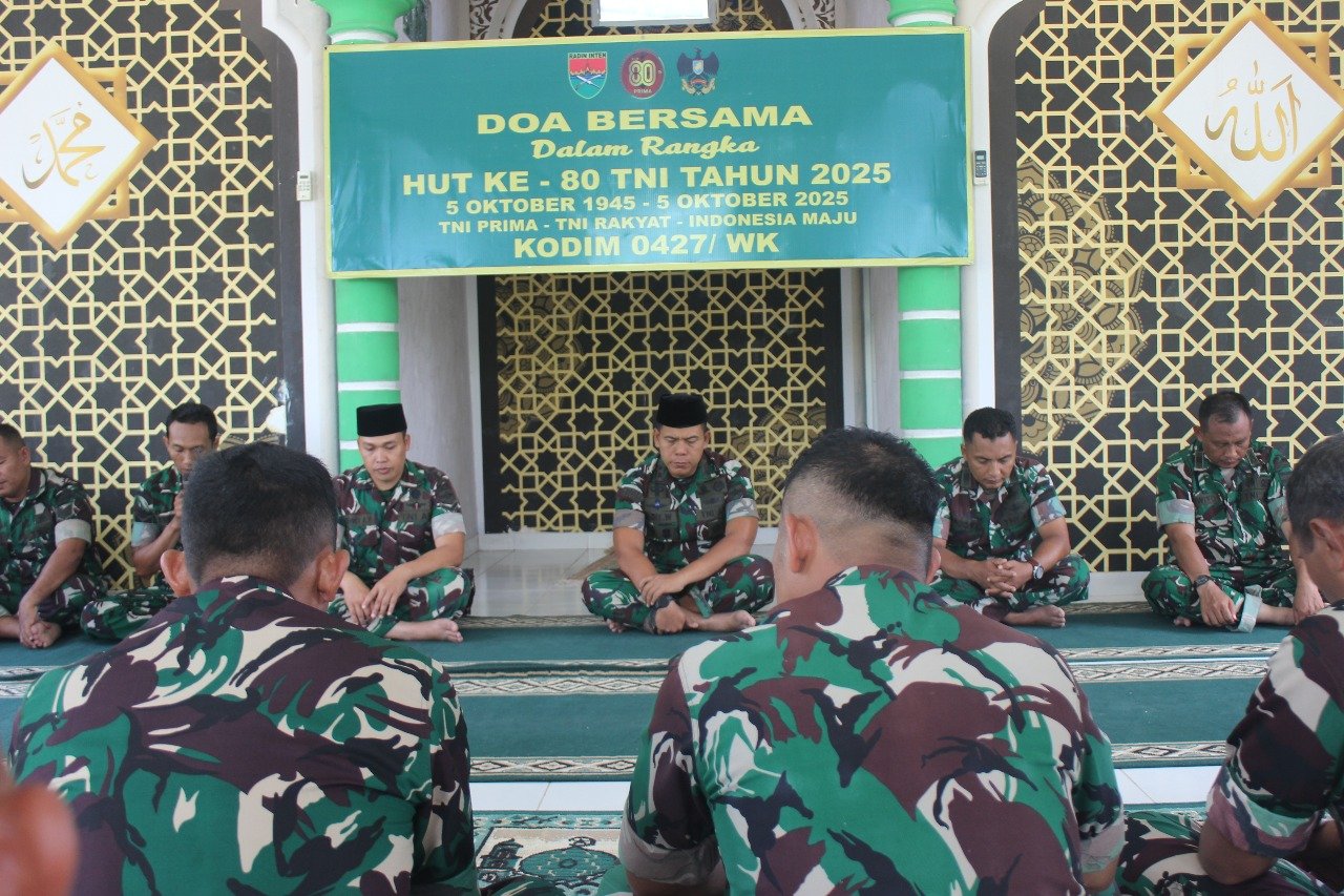 Way Kanan, 4 Oktober 2025 – Dalam rangka memperingati Hari Ulang Tahun (HUT) ke-80 Tentara Nasional Indonesia (TNI), Kodim 0427/Way Kanan menggelar kegiatan doa bersama yang berlangsung khidmat di Mushola Al-Ikhlas Makodim 0427/Way Kanan, pada Sabtu (4/10/2025).