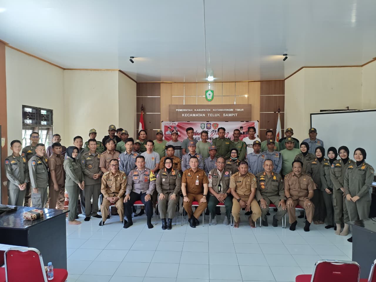 Kotawaringin Timur – Kodim 1015/Sampit melalui Koramil 1015-01/Mhs bersama Satuan Polisi Pamong Praja Kabupaten Kotawaringin Timur dan BPBD Kabupaten Kotawaringin Timur berikan Sosialisasi Penanggulangan Bencana kepada Puluhan Satuan Perlindungan Masyarakat (Satlinmas) Kecamatan Teluk Sampit Yang Bertempat di Kantor Kecamatan Teluk Sampit, Kabupaten Kotawaringin Timur, Selasa (07/10/2025)