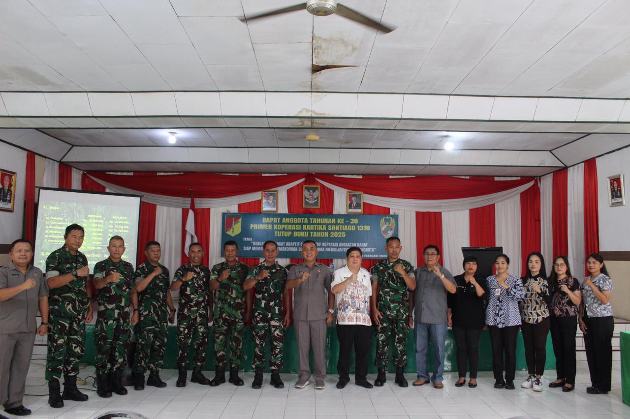 BITUNG – Kodim 1310/Bitung menyelenggarakan Rapat Anggota Tahunan (RAT) ke-30 pada Jumat, (13/02/2026), di Aula Makodim 1310/Bitung, yang bertujuan untuk menutup buku tahun 2025 Primkop Kartika Santiago. Dengan tema ‘Dengan Semangat Adaptif dan Solutif, Koperasi Angkatan Darat Siap Membangun Kemandirian Dalam Rangka Mensejahterakan Anggota’, RAT ini menjadi ajang evaluasi untuk pertanggungjawaban pengurus atas pelaksanaan program dan pengelolaan keuangan selama tahun anggaran 2025.