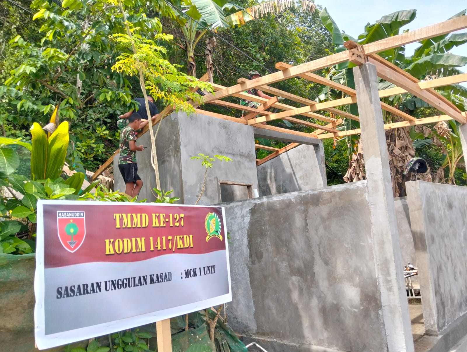 KENDARI – Proses pembangunan Mandi, Cuci, Kakus (MCK) di Kelurahan Sambuli mendapatkan dukungan penuh dari Satgas TMMD ke-127 Kodim 1417/Kendari, pada Selasa (3/3). Dengan semangat gotong royong, para prajurit terlibat aktif dalam menyusun dan memasang rangka atap bangunan tersebut.
