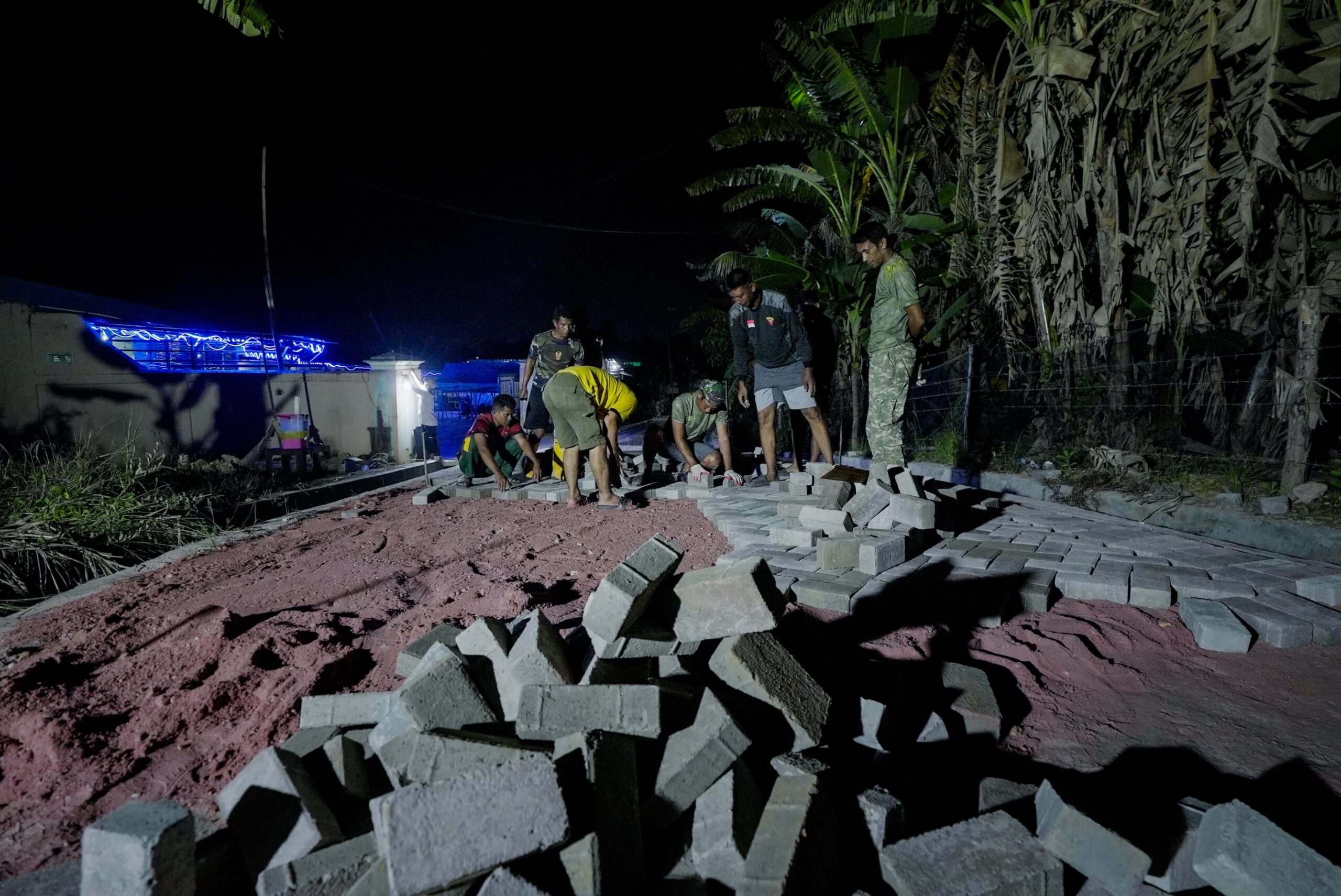 KENDARI – Kemanunggalan antara TNI dan masyarakat kembali terlihat dalam pelaksanaan program TNI Manunggal Membangun Desa (TMMD) ke-127 yang diadakan oleh Kodim 1417/Kendari. Meski malam telah tiba di Kota Kendari, anggota Satgas bersama dengan warga setempat tetap bekerja sama untuk memasang paving blok.