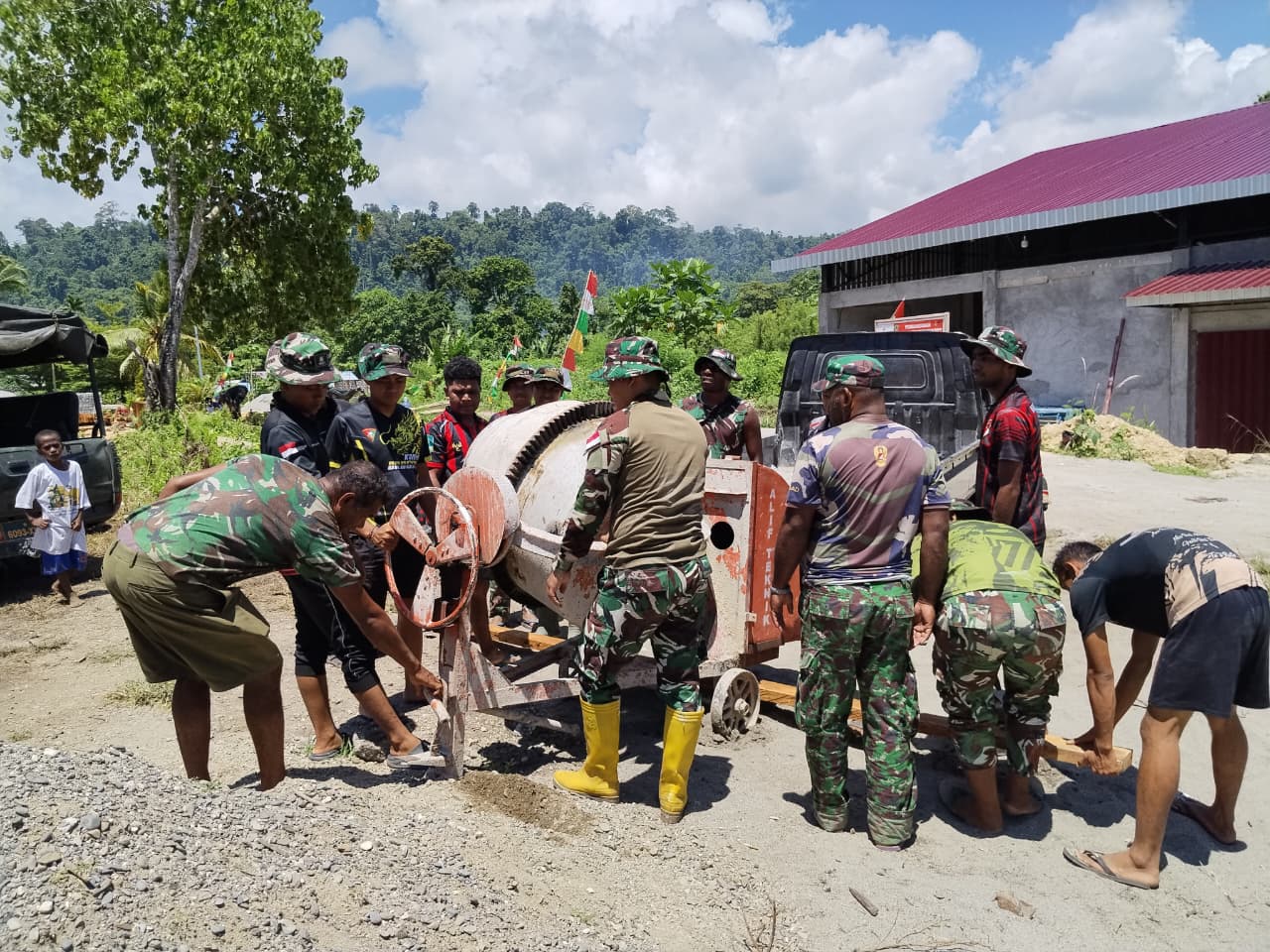 Personel Satgas bersama warga setempat bahu-membahu menurunkan dan memindahkan mesin molen serta perlengkapan lainnya dari kendaraan menuju lokasi pekerjaan.