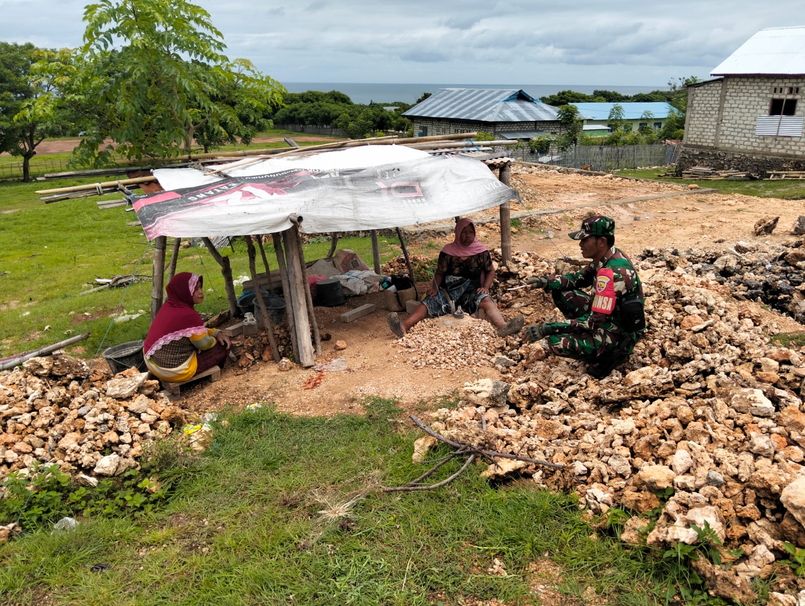 Sertu Ilham Lahiya terjun langsung ke lokasi, di mana warga sedang mengerjakan proyek batu pecah. Dengan berinteraksi secara langsung, Babinsa tidak hanya bisa mengetahui kondisi sosial masyarakat, tetapi juga dapat mendengar langsung kebutuhan mereka.