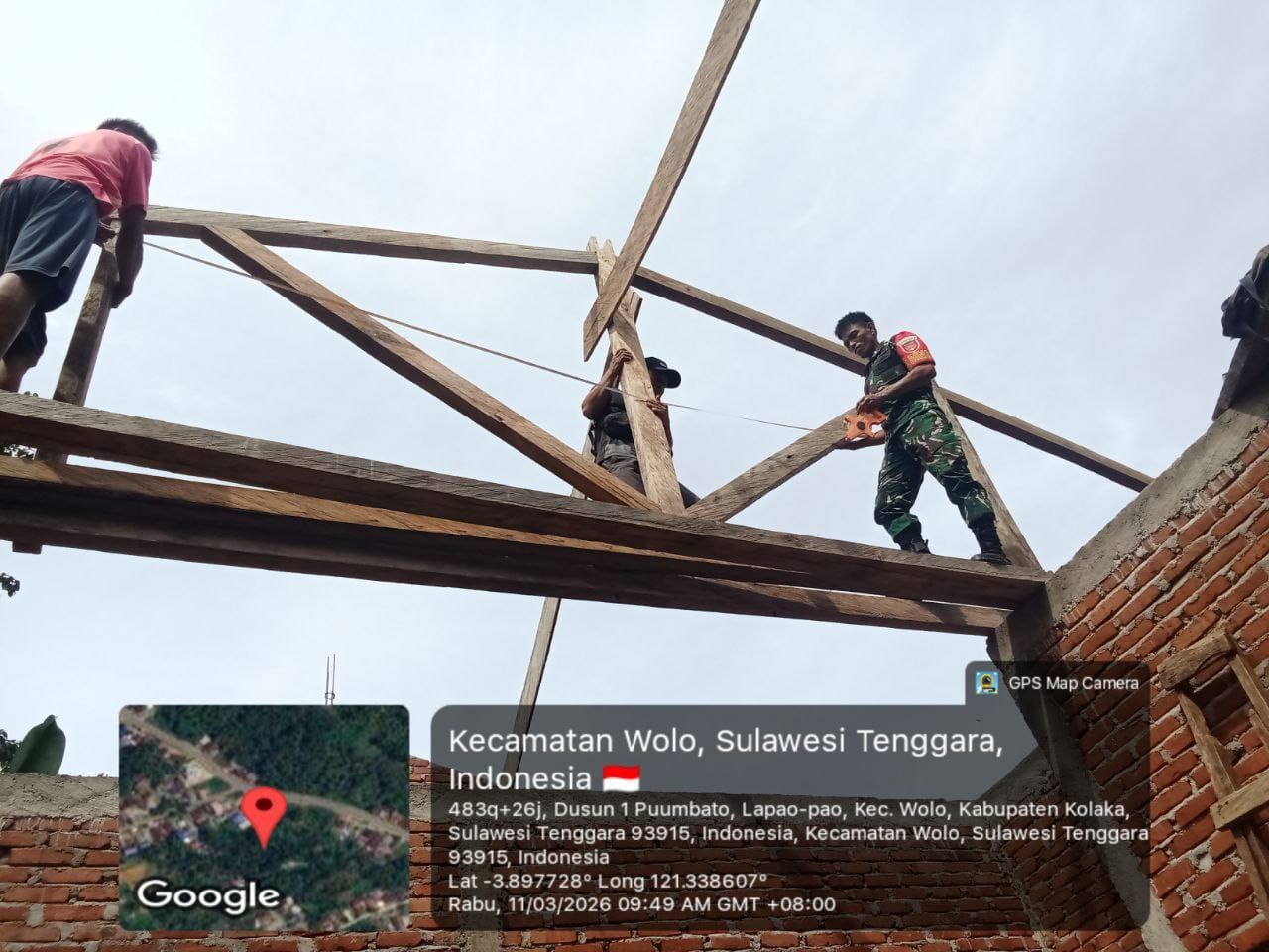 Kolaka – Rabu (11/3/2026), Koptu Suharman dari Babinsa Koramil 1412-04/Kolaka terlibat dalam kegiatan karya bakti dengan membantu pemasangan kuda-kuda rumah milik Bapak Sukri. Kegiatan ini berlangsung di Dusun 1, Desa Ulu Lapapao, Kecamatan Wolo, Kabupaten Kolaka.