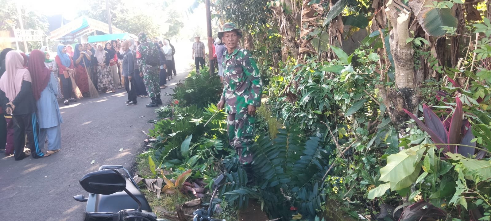 Personel Koramil mengajak warga untuk aktif dan menjadi motivator penggerak masyarakat untuk gotong royong peduli terhadap kebersihan lingkungan. Kegiatan kerja bakti tersebut fokus pada pembersihan bahu jalan dan selokan yang telah tumbuh rumput liar dan banyak sampah yang mengotori pinggir jalan.