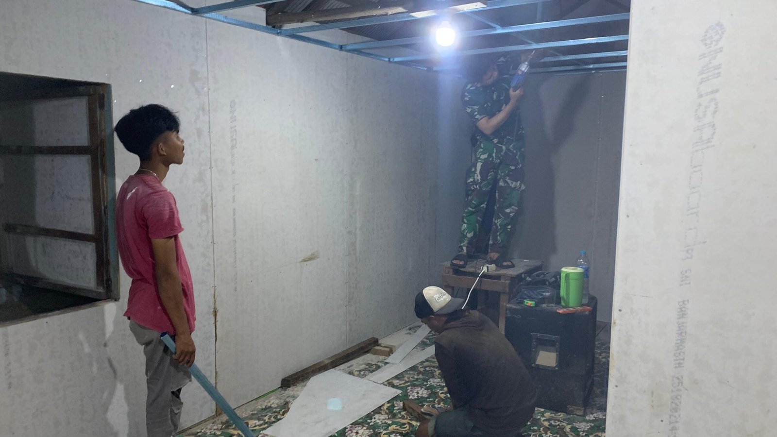 Dengan bantuan lampu, Satgas dan warga tetap dapat bekerja lembur memperbaiki rumah warga meski sudah malam. Aktivitas ini menunjukkan dedikasi tinggi dan semangat gotong royong tanpa mengenal batas waktu.