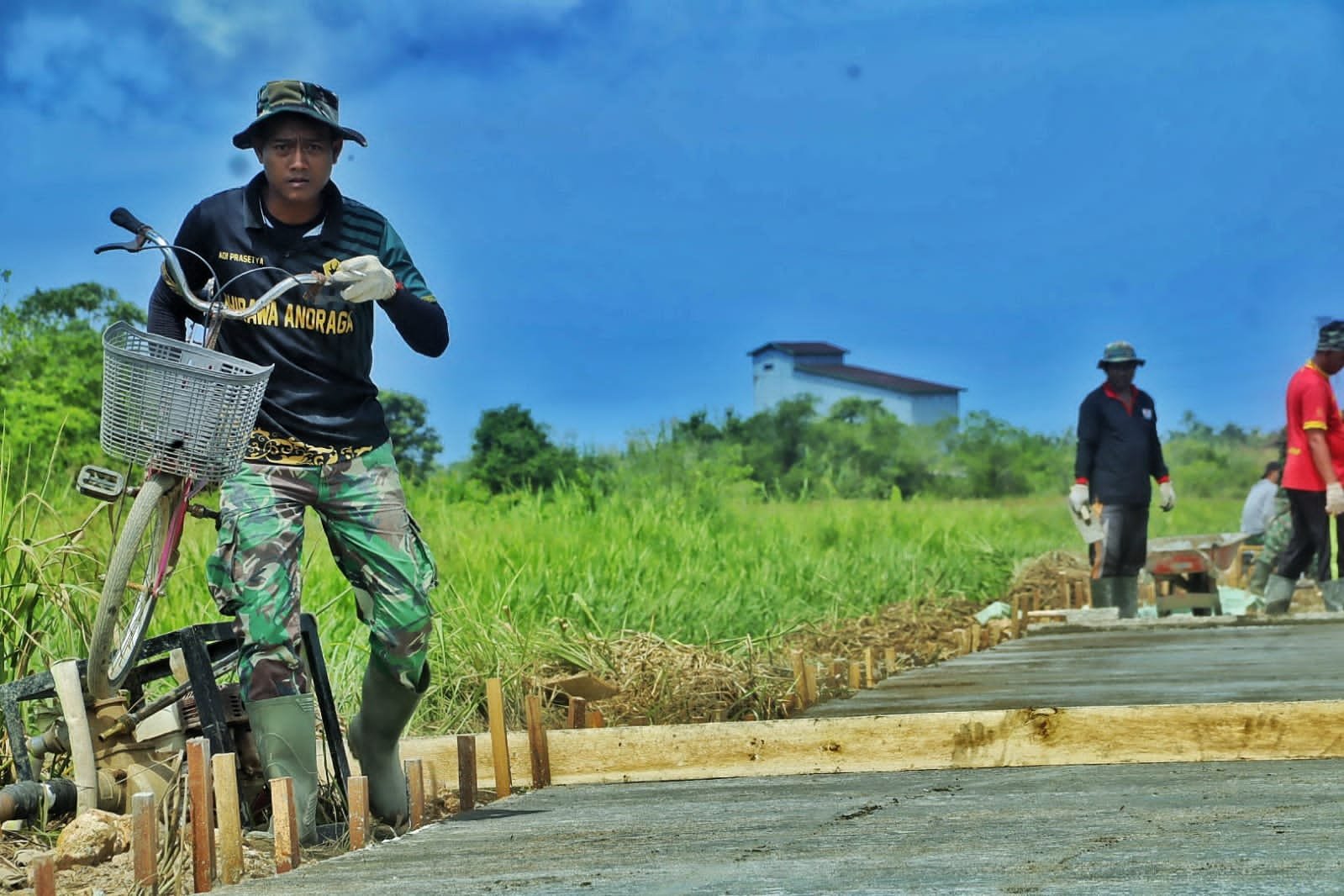 Jalan rabat beton yang sedang dibangun masih dalam proses pengerjaan dan sebagian besar jalur masih berlumpur serta berisiko tergelincir bagi pengguna jalan, terutama anak-anak sekolah yang melintas pagi hari. Melihat hal tersebut, salah seorang anggota Satgas TMMD langsung sigap membantu menuntun sepeda pelajar tersebut agar bisa melintas dengan aman.