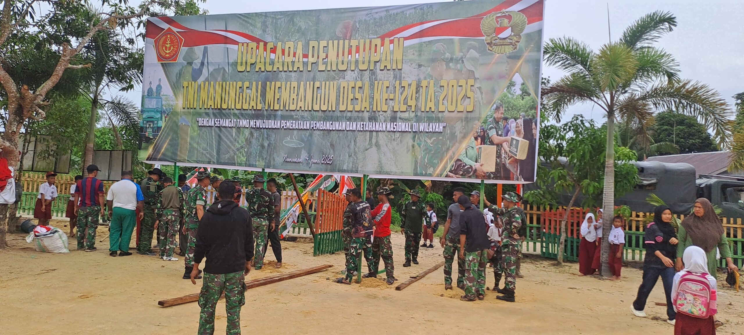 NUNUKAN – Menjelang puncak acara penutupan program TNI Manunggal Membangun Desa (TMMD) Ke-124 Tahun 2025, Komando Distrik Militer (Kodim) 0911/Nunukan di bawah naungan Komando Resort Militer (Korem) 091/Aji Surya Natakesuma dan Kodam VI/Mulawarman, gencar melakukan berbagai persiapan akhir yang terperinci. Salah satu persiapan kunci adalah pembuatan kerangka kokoh untuk banner upacara penutupan TMMD yang akan menjadi penanda visual utama, direncanakan dengan khidmat di halaman luas SDN 002 Mansapa, sebuah lokasi strategis di Kecamatan Nunukan Selatan yang menjadi pusat perhatian selama berlangsungnya TMMD ini. Pemilihan lokasi ini mencerminkan kedekatan antara TNI dengan masyarakat, di mana fasilitas umum seperti sekolah menjadi titik pertemuan dan simbol kemajuan bersama.