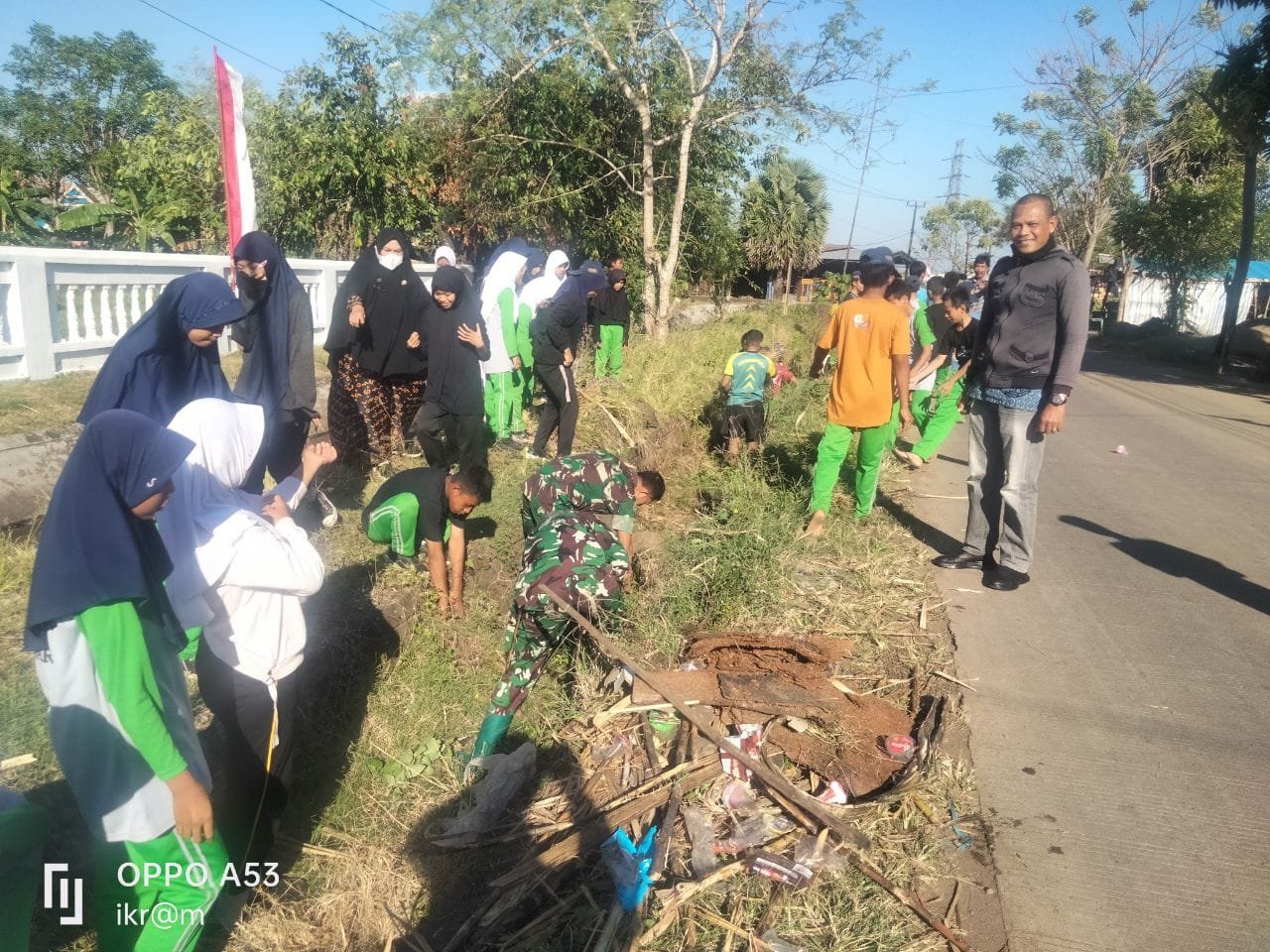 TAKALAR — Wujudkan kemanunggalan TNI dengan rakyat, Personel Koramil 1426-02/Polsel, Kodim 1426/Takalar bersama siswa dan guru SMP Negeri 3 Takalar melaksanakan Pembersihan saluran air sepanjang ± 150 meter serta sampah organik dan non organik di Kelurahan Bontokadatto Kecamatan Polsel Kabupaten Takalar. Minggu 07/09/2025.