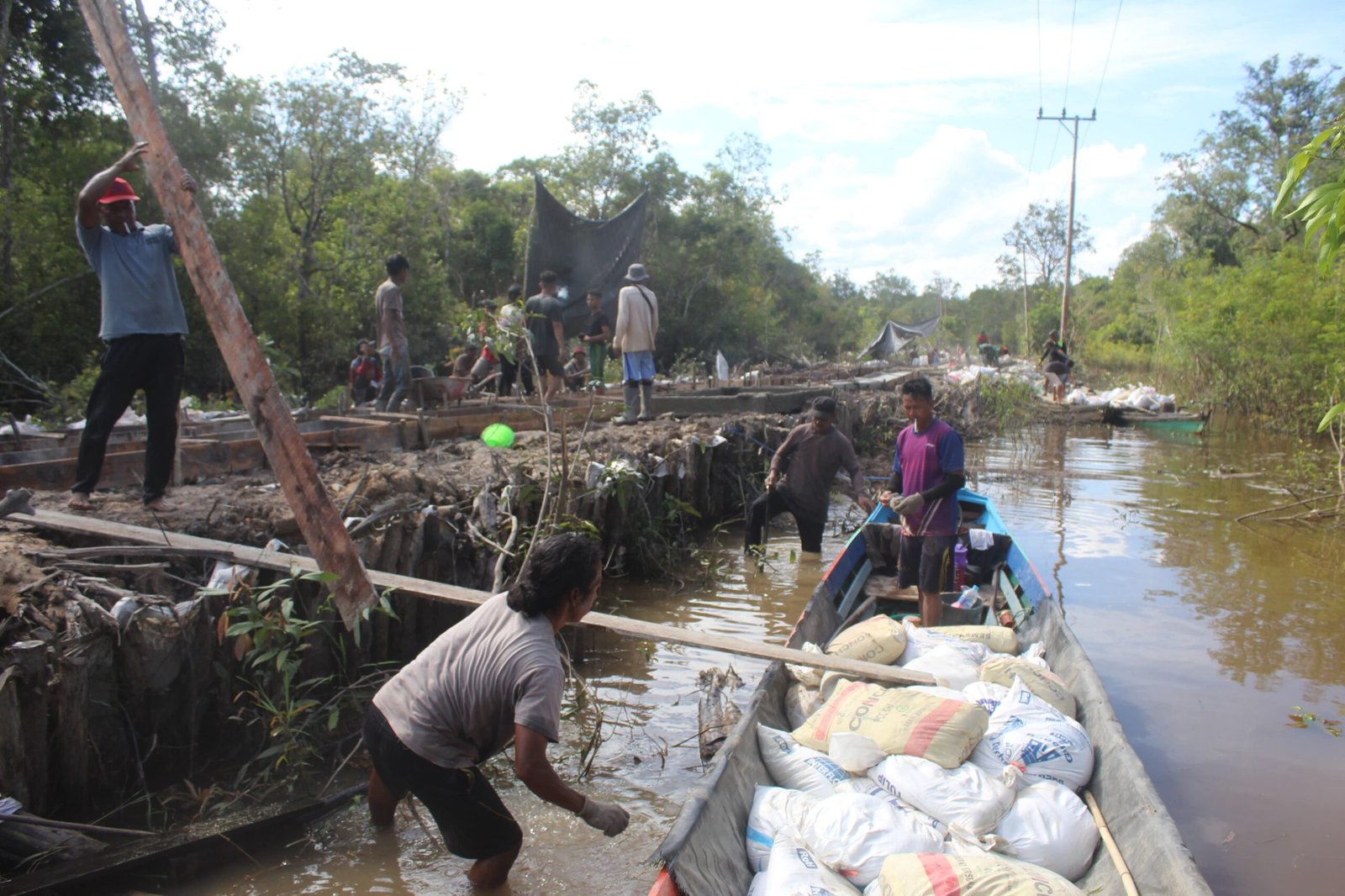 Proses pengangkutan dilakukan dengan memanfaatkan akses darat yang masih bisa dilalui, meskipun dalam kondisi terbatas. Di beberapa lokasi yang sulit dijangkau, material dibawa secara manual atau menggunakan bantuan alat sederhana agar dapat mencapai lokasi pekerjaan.