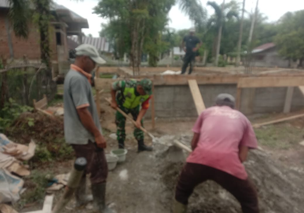 ACEH BARAT — Dalam upaya mewujudkan sinergitas antara TNI dan rakyat, Babinsa Posramil 06/Bubon Kodim 0105/Aceh Barat, Serda Hendri, membantu warga membangun rumah di Desa Layung, Kecamatan Bubon, Kabupaten Aceh Barat, Jum’at (7/11/2025).