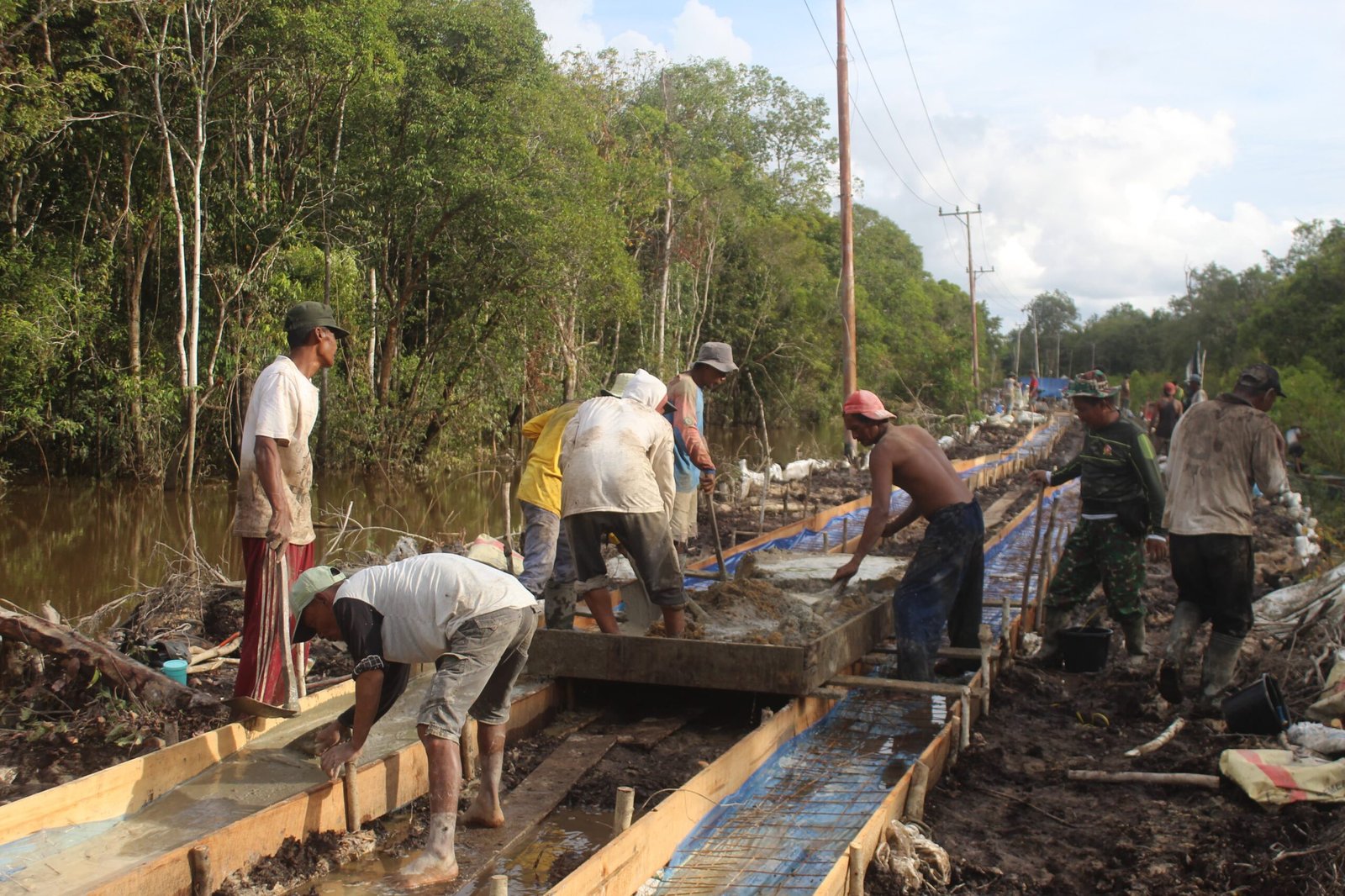 Dengan cangkul dan sekop, mereka mencampur bahan-bahan bangunan seperti pasir, semen, dan air demi memperlancar proses pengecoran. Momen ini menjadi simbol kuatnya semangat gotong royong di tengah keterbatasan alat berat.