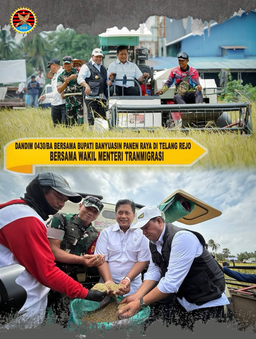 Muara Telang, Kabupaten Banyuasin – Dalam upaya mendukung sektor pertanian dan meningkatkan kesejahteraan petani, Komandan Kodim 0430/Banyuasin, Letkol Inf Handoyo Yudi Prasetyo, S.E., M.H.I., M.Han., berkolaborasi dengan Wakil Menteri Transmigrasi RI, Viva Yoga Mauladi, dan Bupati Banyuasin, melakukan panen raya padi di Desa Telang Rejo pada Kamis, 22 Januari 2025.
