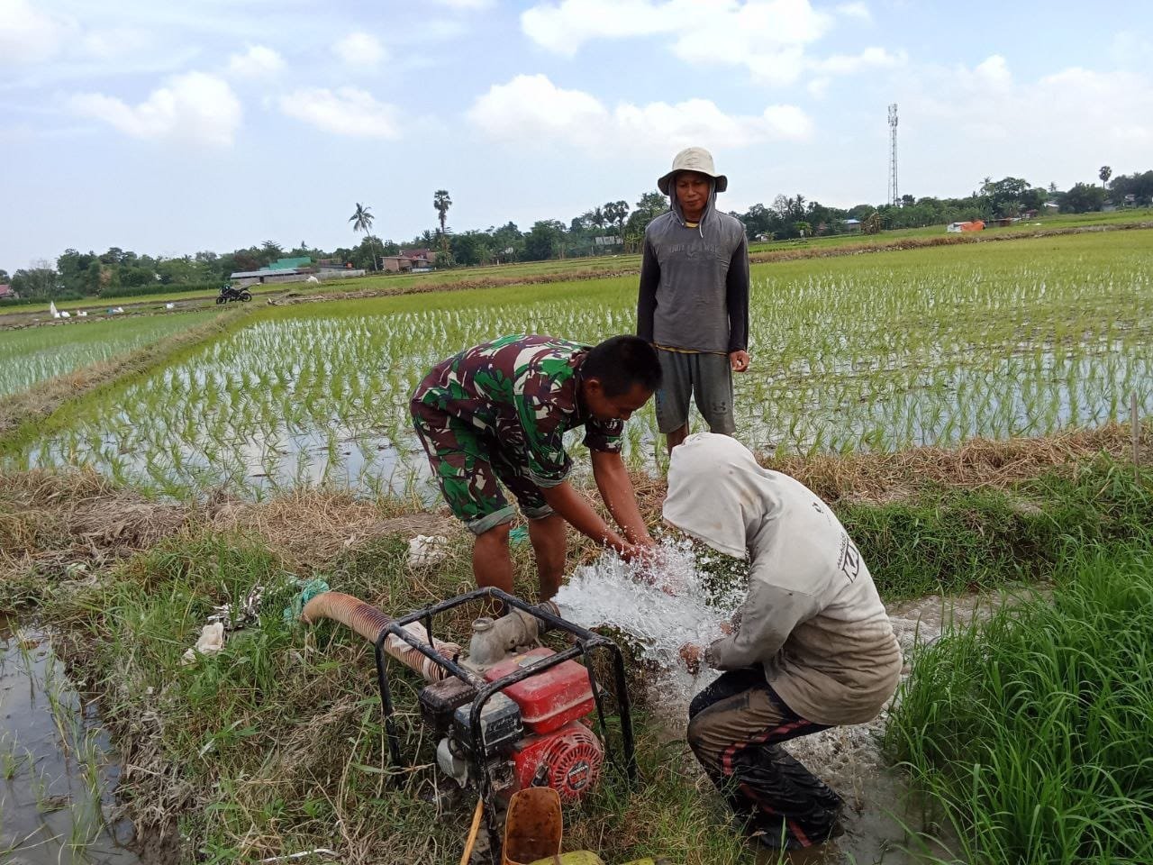 Babinsa Serka Herman mengatakan bahwa perlu kerja keras untuk mempertahankan tanaman padi dalam memenuhi kebutuhan pengairan, tidak harus menunggu hujan turun akan tetapi dengan menggunakan mesin pompa air.