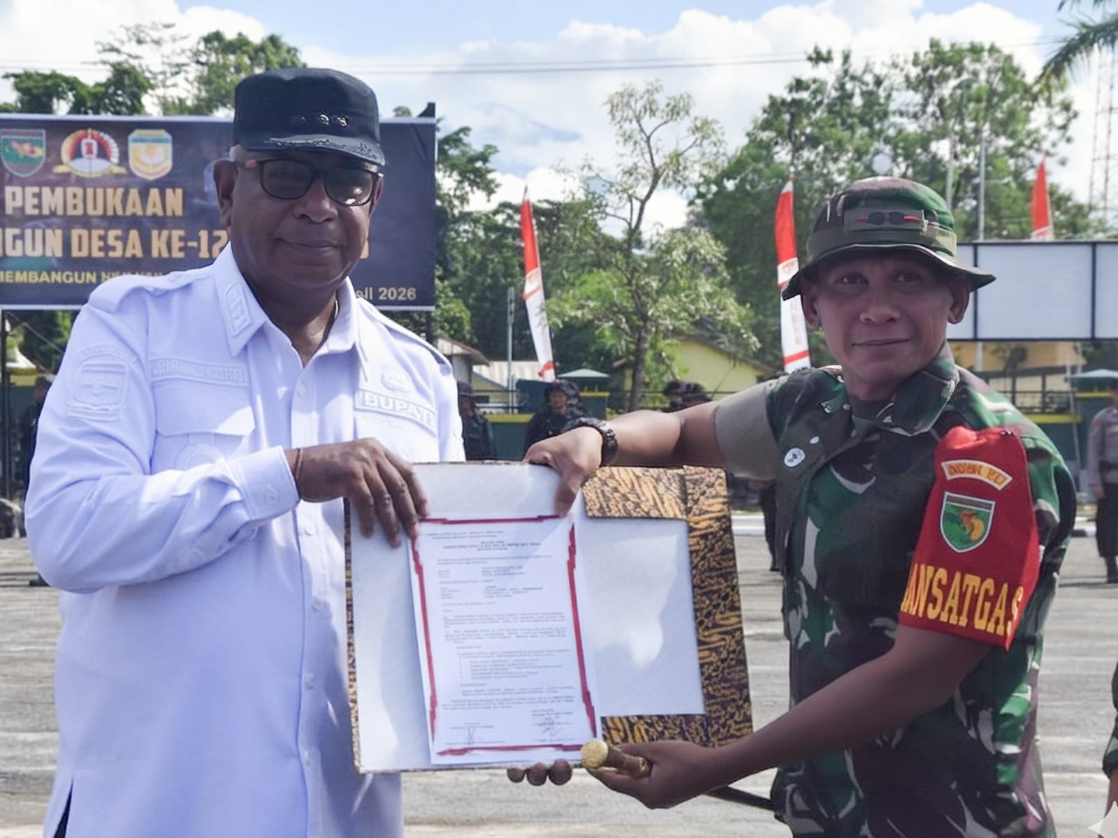Timika – Pelaksanaan Program TNI Manunggal Membangun Desa (TMMD) Ke-128 di Kabupaten Mimika resmi dimulai dengan penandatanganan naskah serah terima kegiatan pada Rabu, 22 April 2026. Proses penandatanganan tersebut dilakukan oleh Bupati Mimika bersama Dansatgas TMMD dan dihadiri oleh berbagai pejabat dari TNI, Polri, serta pemerintah daerah setempat.