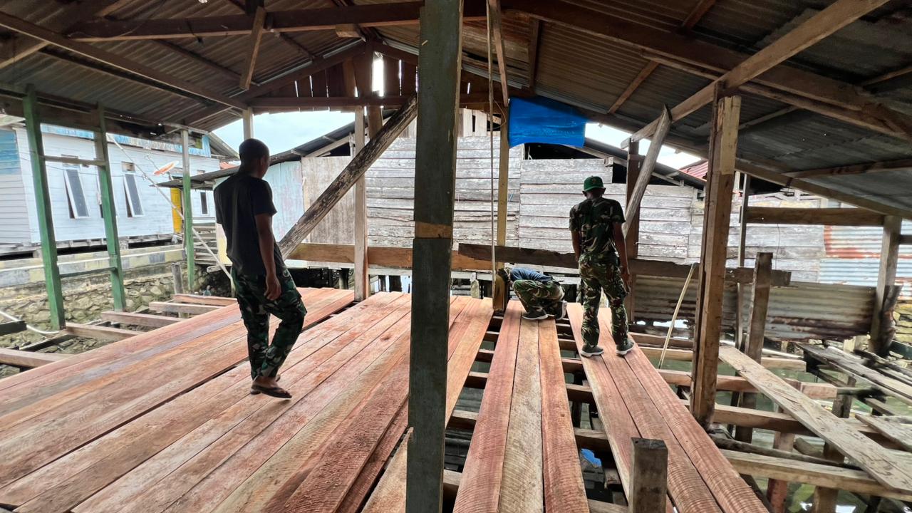 Pemasangan lantai ini merupakan langkah penting agar rumah dapat segera dihuni dengan layak. Dengan penuh kehati-hatian, prajurit TNI memasang papan lantai dengan presisi tinggi, memastikan keawetan dan kenyamanan bagi penghuninya. Proses pemasangan dilakukan secara bergotong royong dengan dukungan masyarakat setempat.