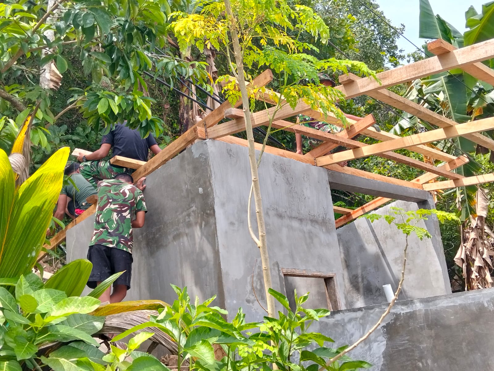 KENDARI – Satgas TMMD ke-127 dari Kodim 1417/Kendari kini memasuki fase penting dalam pembangunan, dengan penekanan pada pemasangan rangka atap MCK di Kelurahan Sambuli, yang dilakukan pada Selasa (3/3). Pemasangan rangka atap ini menjadi elemen krusial yang menentukan ketahanan bangunan terhadap berbagai kondisi cuaca. Para prajurit terlihat bekerja sama mengangkat material kayu ke atas dinding beton yang telah selesai dikerjakan sebelumnya. Rangka atap yang dirakit dengan cermat ini bertujuan untuk memberikan dukungan yang kuat bagi atap sementara juga memastikan aliran air hujan berlangsung lancar. Kegiatan ini menegaskan komitmen TNI dalam menyediakan fasilitas sanitasi yang tidak hanya tepat waktu dalam penyelesaiannya, tetapi juga berkualitas serta tahan lama. Seiring dengan berjalannya waktu, pembangunan MCK di Sambuli menunjukkan kemajuan yang signifikan dan semakin mendekati penyelesaian akhir.