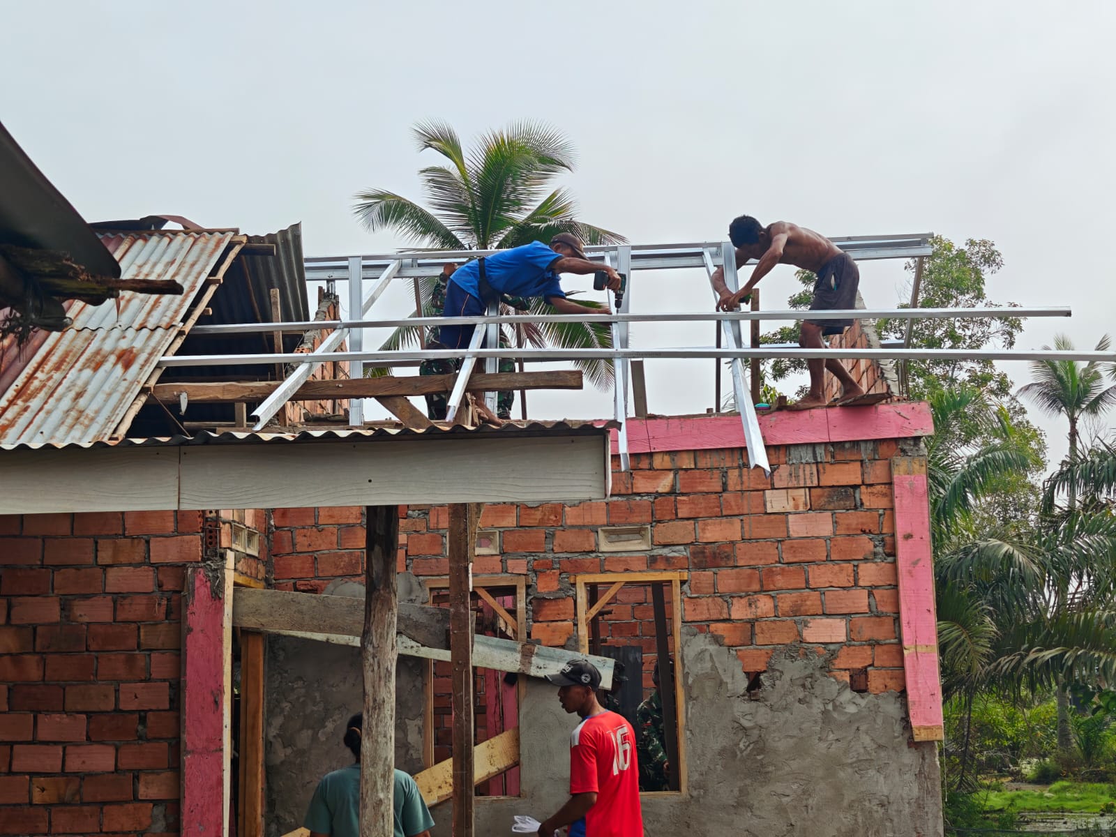 Saat ini, fokus utama anggota Satgas adalah pemasangan rangka baja, yang berfungsi sebagai struktur dasar atap rumah. Proses ini dilakukan dengan cermat untuk memastikan bahwa bangunan yang dihasilkan akan kokoh dan memiliki daya tahan yang baik.