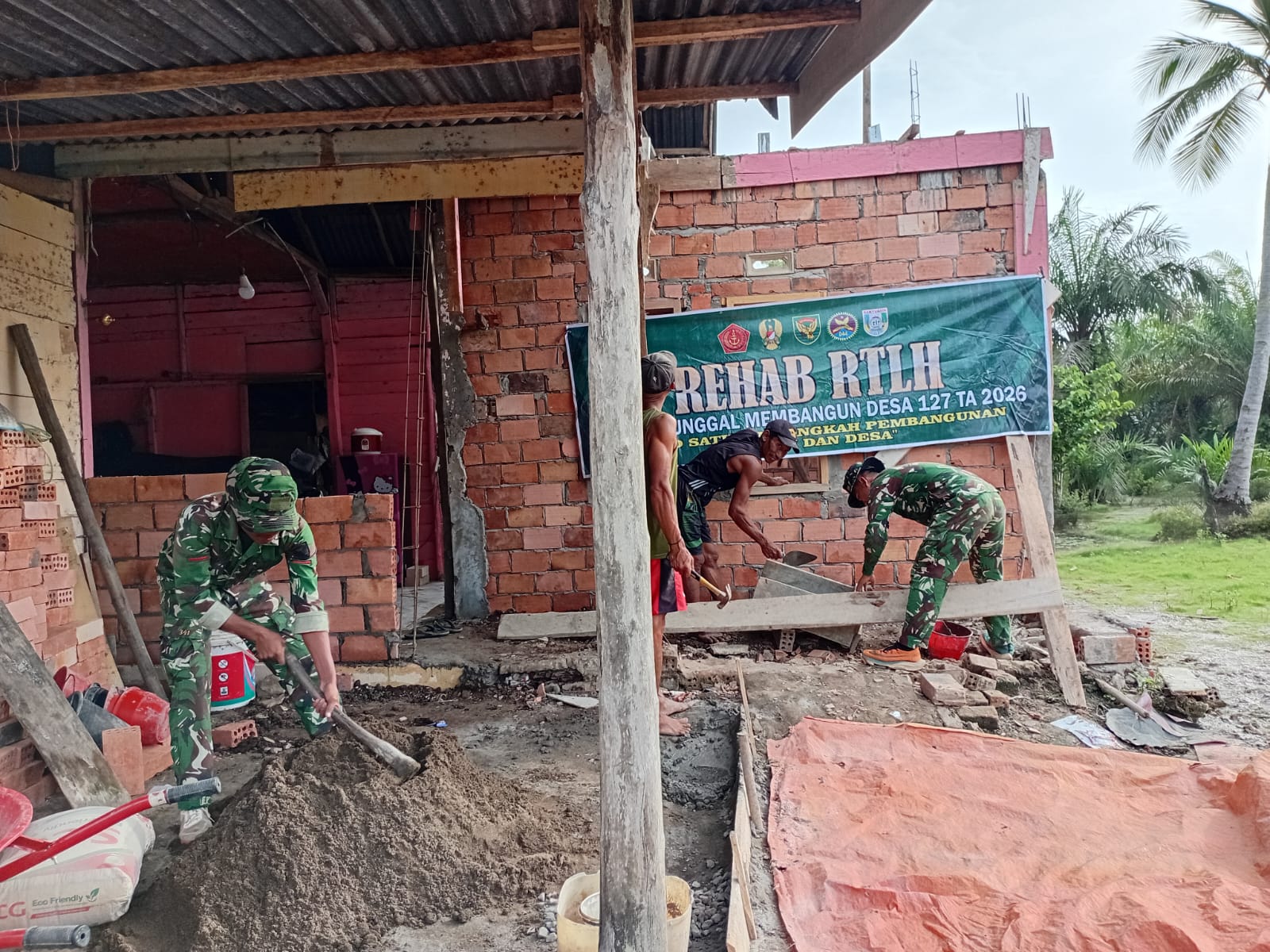 Banyuasin – Satgas TMMD 127 yang berasal dari Kodim 0430/BA, bekerja sama dengan masyarakat Desa Wonosari, mempercepat pembangunan Rumah Tidak Layak Huni (RTLH) milik Bapak Paiman melalui pemasangan tebeng layar.