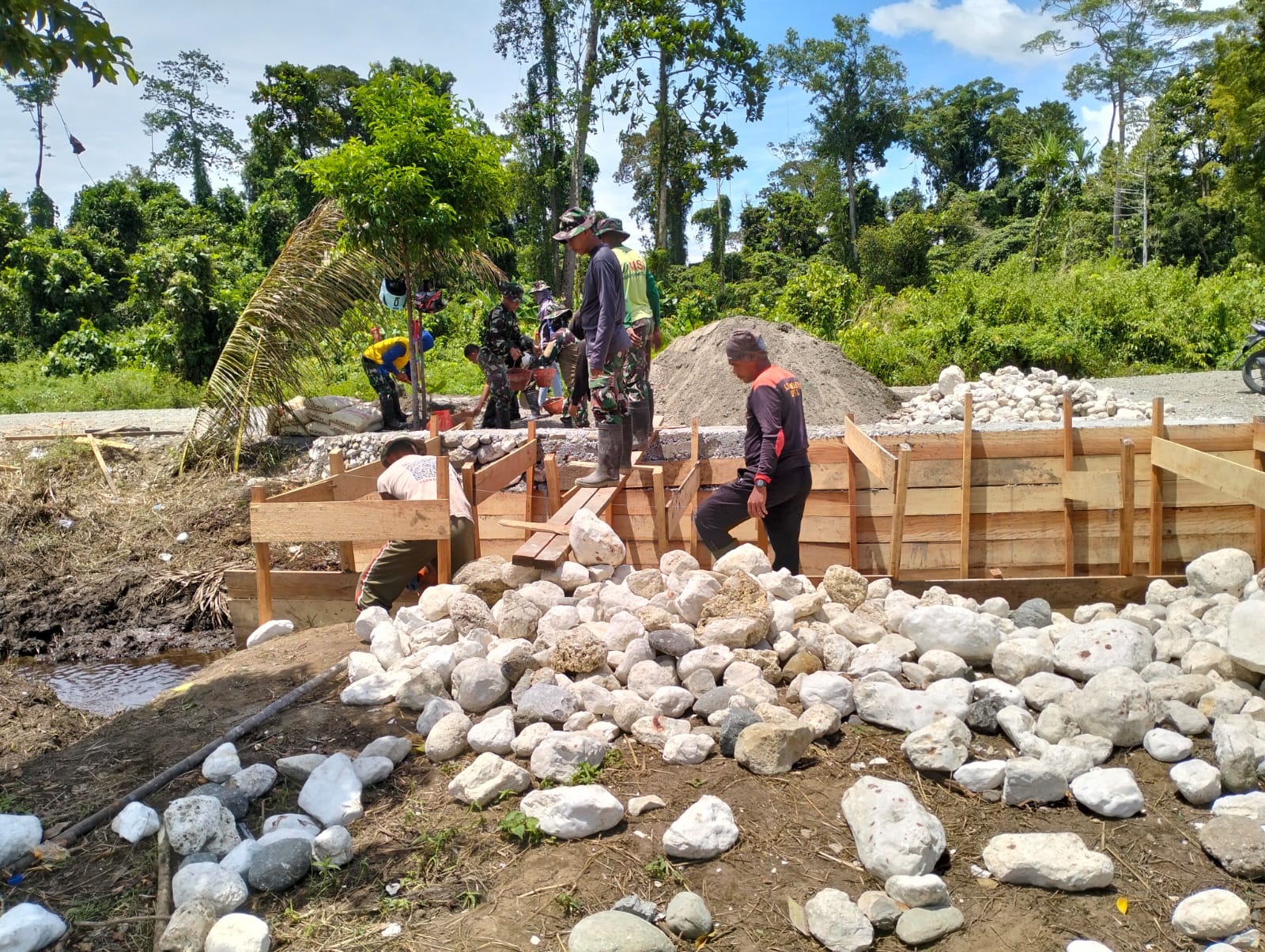 Kodim 1705/Nabire menunjukkan dedikasi tinggi dalam mempercepat pembangunan jembatan yang sangat dibutuhkan oleh masyarakat setempat. Setiap hari, para prajurit bekerja keras di lapangan, menunjukkan komitmen mereka untuk menyelesaikan proyek ini secepat mungkin. Hal ini tidak hanya mencerminkan profesionalisme TNI, tetapi juga semangat yang kuat untuk membantu warga di daerah tersebut.