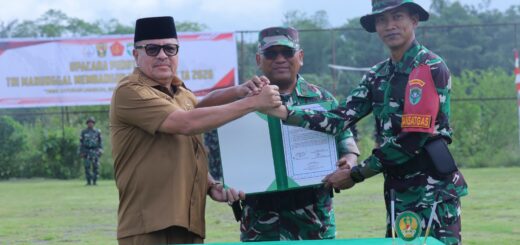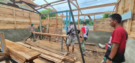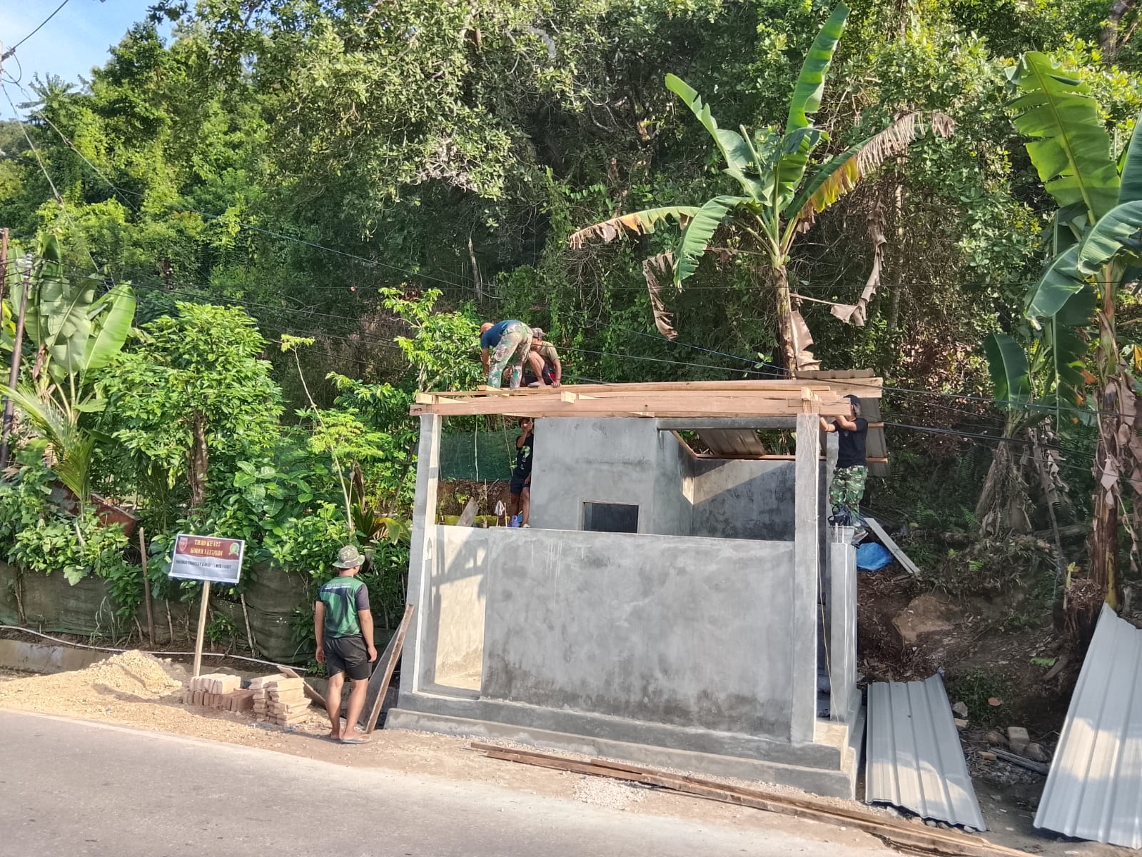 Kendari – Anggota Satgas TMMD ke-127 dari Kodim 1417/Kendari bersama dengan masyarakat setempat sedang giat melaksanakan pemasangan atap untuk Mandi, Cuci, Kakus (MCK) di Kelurahan Sambuli, Kota Kendari, pada Minggu (8/3).