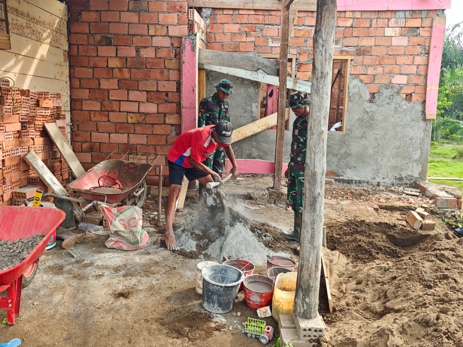 Di sisi lain, anggota tim juga sibuk melaksanakan plester dinding sebagai langkah untuk menyempurnakan struktur bangunan. Pekerjaan ini dilakukan dengan teliti agar hasil akhir tampil rapi dan siap untuk tahap finishing selanjutnya.