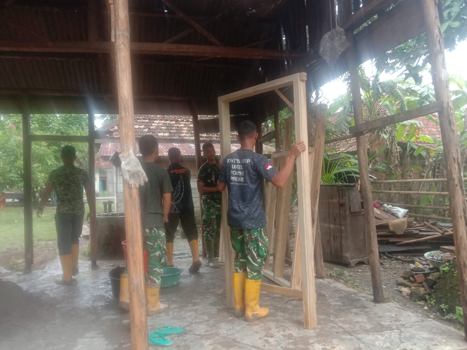 Di lokasi pembangunan, anggota Satgas TMMD bersama masyarakat terlihat kompak merangkai kayu yang telah disiapkan. Setiap potongan kayu diukur secara teliti agar menghasilkan kusen yang presisi, kuat, serta sesuai dengan struktur rumah yang sedang dibangun.