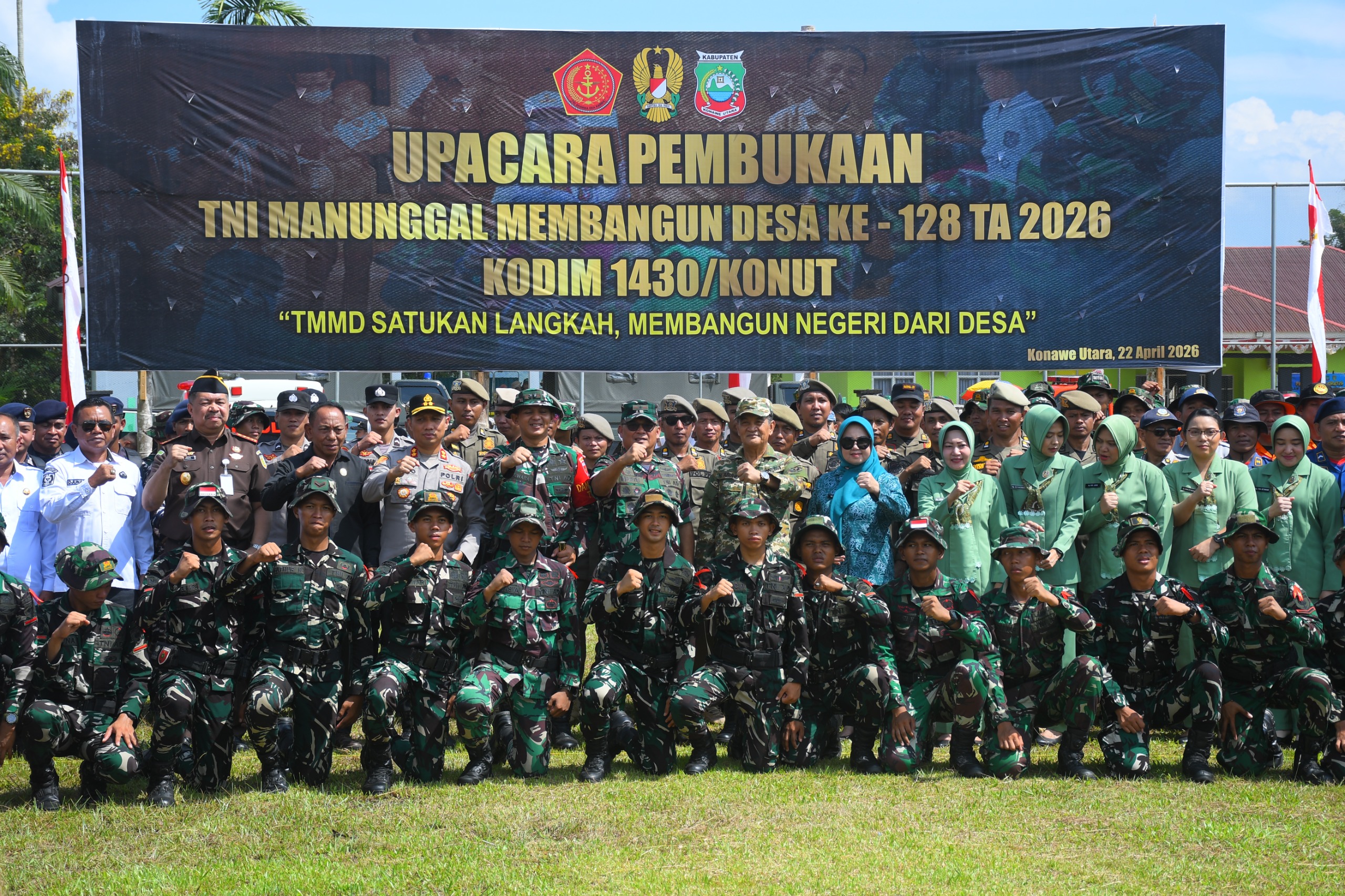 Konawe Utara – Program TNI Manunggal Membangun Desa (TMMD) ke-128 Tahun Anggaran 2026 Kodim 1430/Konawe Utara resmi dimulai melalui upacara yang dilaksanakan di Lapangan Sepak Bola Apdasi, Kelurahan Andowia, Kecamatan Andowia, Kabupaten Konawe Utara, pada Rabu (22/4/2026) pukul 09.00 WITA. Kegiatan ini mengusung tema ‘TMMD Satukan Langkah Membangun Negeri dari Desa’ dan dihadiri oleh sekitar 300 peserta serta undangan lainnya.