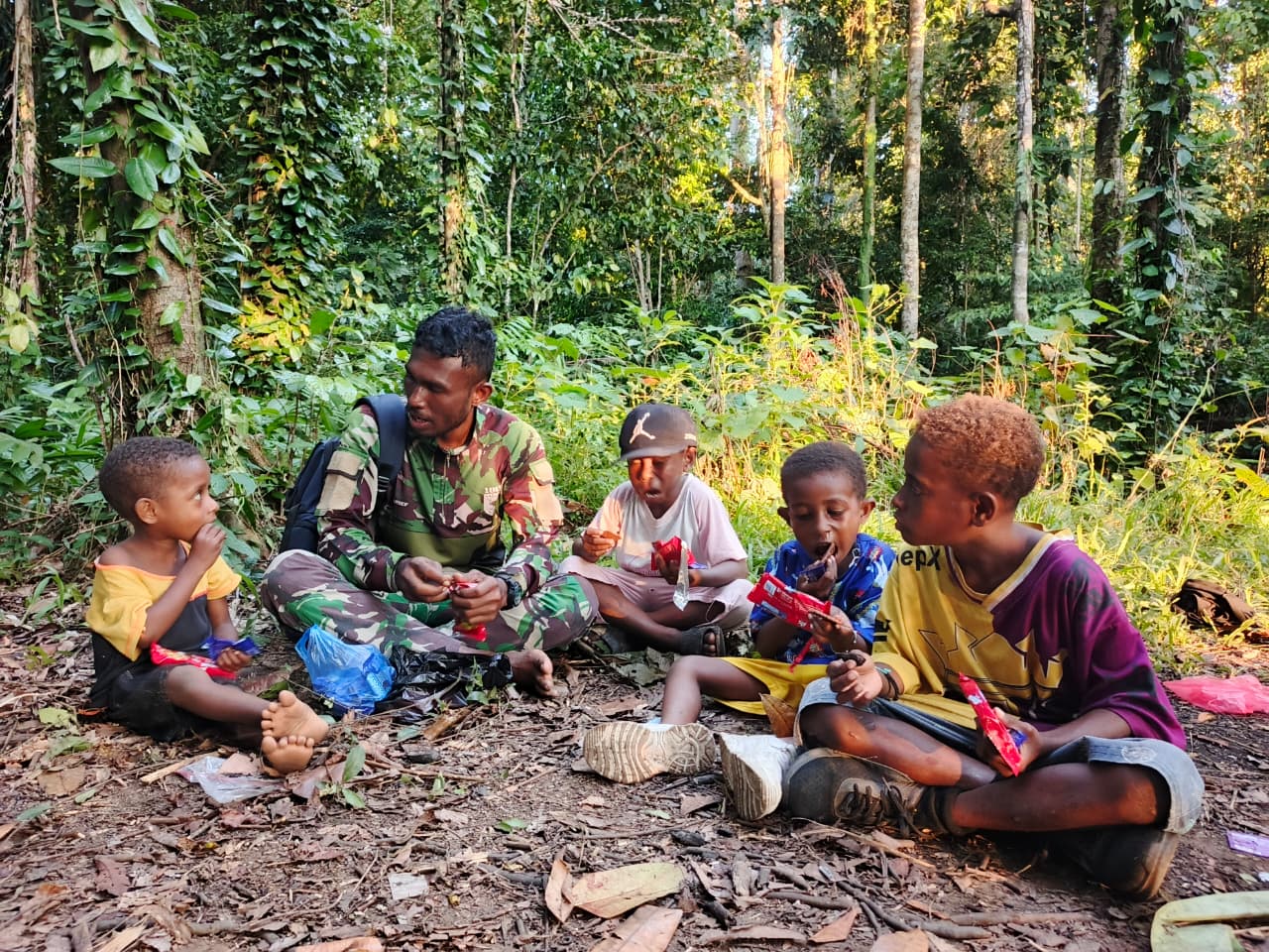 Manokwari Utara — Satgas TMMD ke-128 Kodim 1801/Manokwari terus mengedepankan pendekatan humanis dalam setiap kegiatan di Kampung Tanah Rubuh, salah satunya melalui aksi berbagi makanan ringan kepada anak-anak.