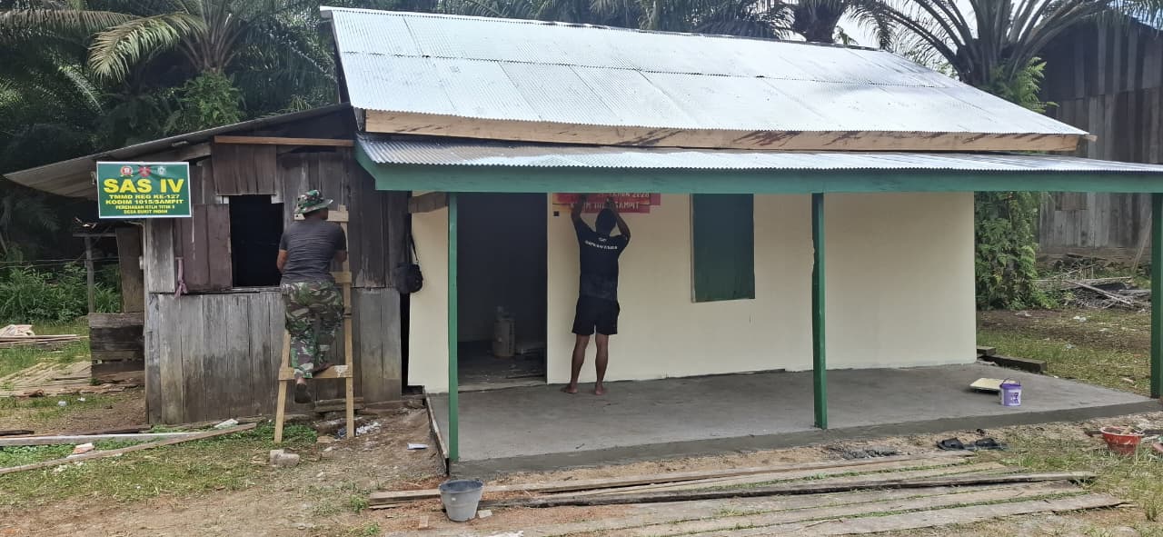 Kotawaringin Timur – Program TNI Manunggal Membangun Desa (TMMD) ke-127 yang dilaksanakan oleh Kodim 1015/Sampit terus menunjukkan kemajuan yang signifikan. Salah satu fokus fisik dari program ini adalah rehabilitasi Rumah Tidak Layak Huni (RTLH) milik Tuminah yang terletak di Desa Bukit Indah, Kecamatan Telaga Antang, Kabupaten Kotawaringin Timur. Pada Senin (09/03/2026), proyek ini telah memasuki tahap akhir proses renovasi.