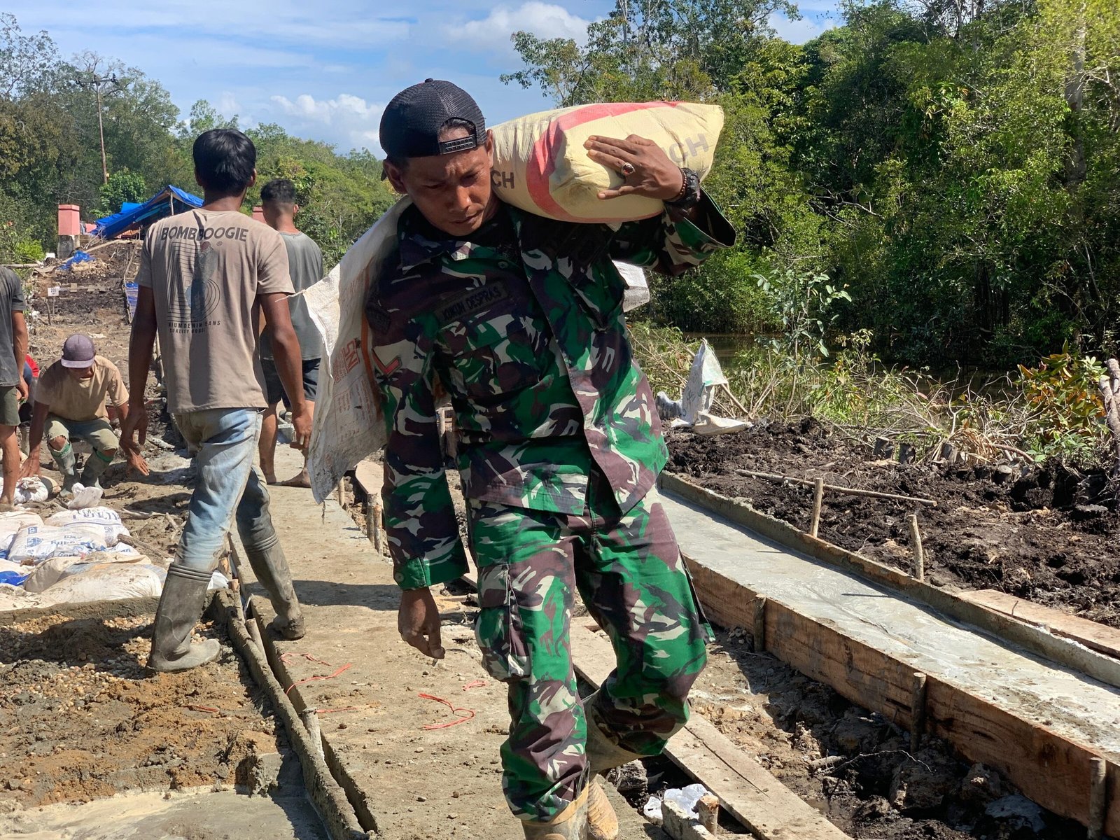Di tengah medan yang sulit dijangkau kendaraan, para anggota Satgas TMMD dengan sigap memikul material berupa semen secara manual demi kelancaran pembangunan infrastruktur peningkatan badan jalan di Desa Talio