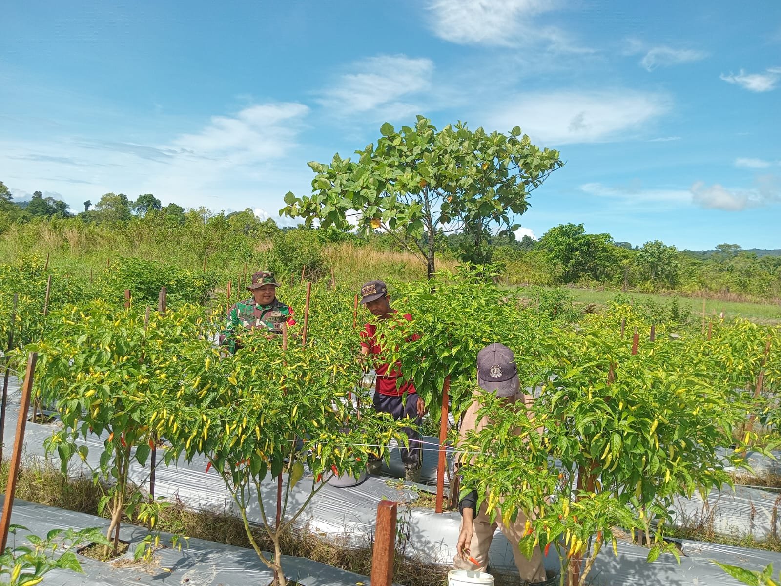 Kwatisore ~ Babinsa Koramil 1705-03/Kwatisore, Pelda M. Muslim membantu petani panen cabe dengan areal lahan seluas 0,5 HA milik petani bapak mulyono di Kampung Wami jaya Distrik Yaur Kab Nabire Provinsi Papua Tengah.