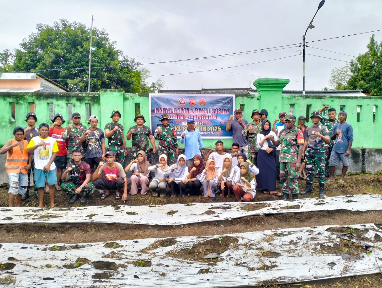 Halmahera Utara – Dalam rangka memperingati Hari Ulang Tahun (HUT) ke-80 Tentara Nasional Indonesia (TNI), Kodim 1508/Tobelo melaksanakan karya bakti diwilayah binaan Koramil 1508-02/Galela berupa pembersihan lingkungan serta penanaman bibit cabai di lahan ketahanan pangan Panti Asuhan Tarakani, Desa Togawa Besi, Kecamatan Galela Selatan, Kabupaten Halmahera Utara, Jumat (19/09/2025).