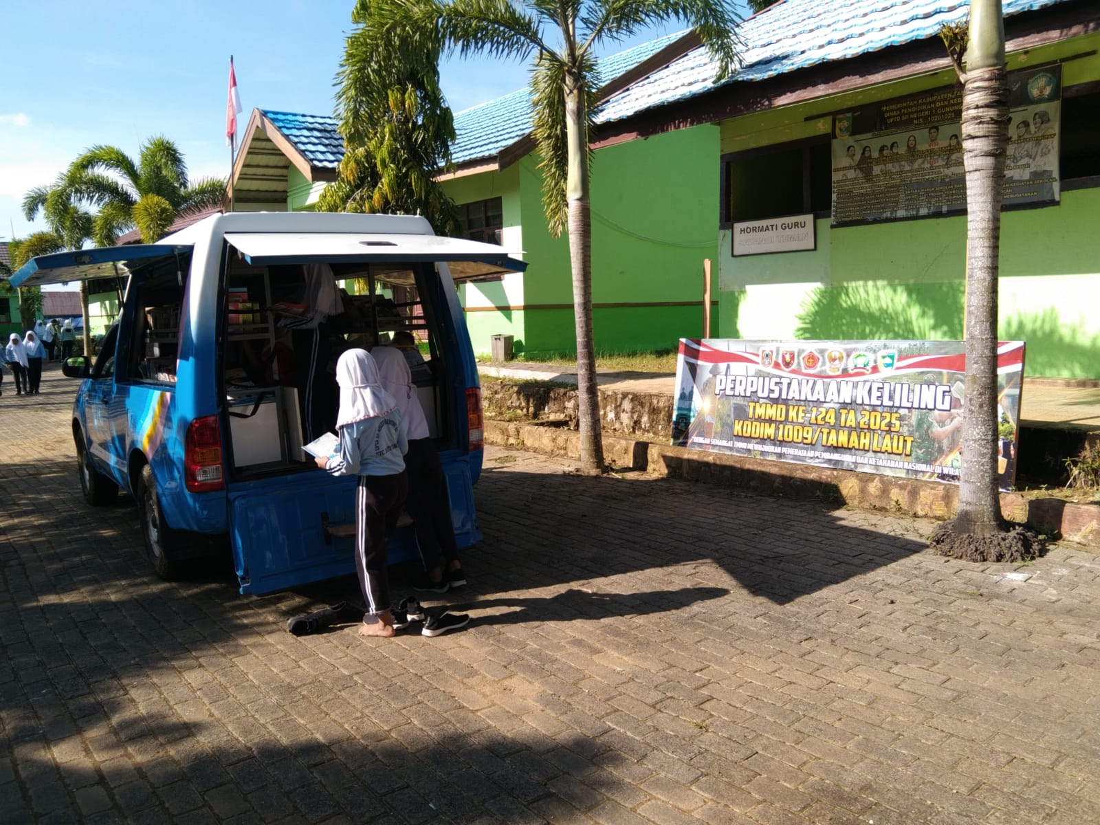 TANAH LAUT – Puluhan siswa-siswi UPTD SDN 1 Gunung Melati, Desa Gunung Melati, Kecamatan Batu Ampar, Kabupaten Tanah laut, Selasa (20/05/2025) pagi tadi tampak sumringah. Hal ini dikarenakan hadirnya perpustakaan keliling di sekolah mereka. Perpustakaan keliling yang dikelola oleh Dinas Perpustakaan dan Kearsipan Kabupaten Tanah Laut tersebut sengaja dihadirkan di lokasi TNI Manunggal Membangun Desa (TMMD) ke-124 Kodim 1009/Tanah Laut sebagai salah satu sasaran non fisik dalam program TMMD Tahun ini.