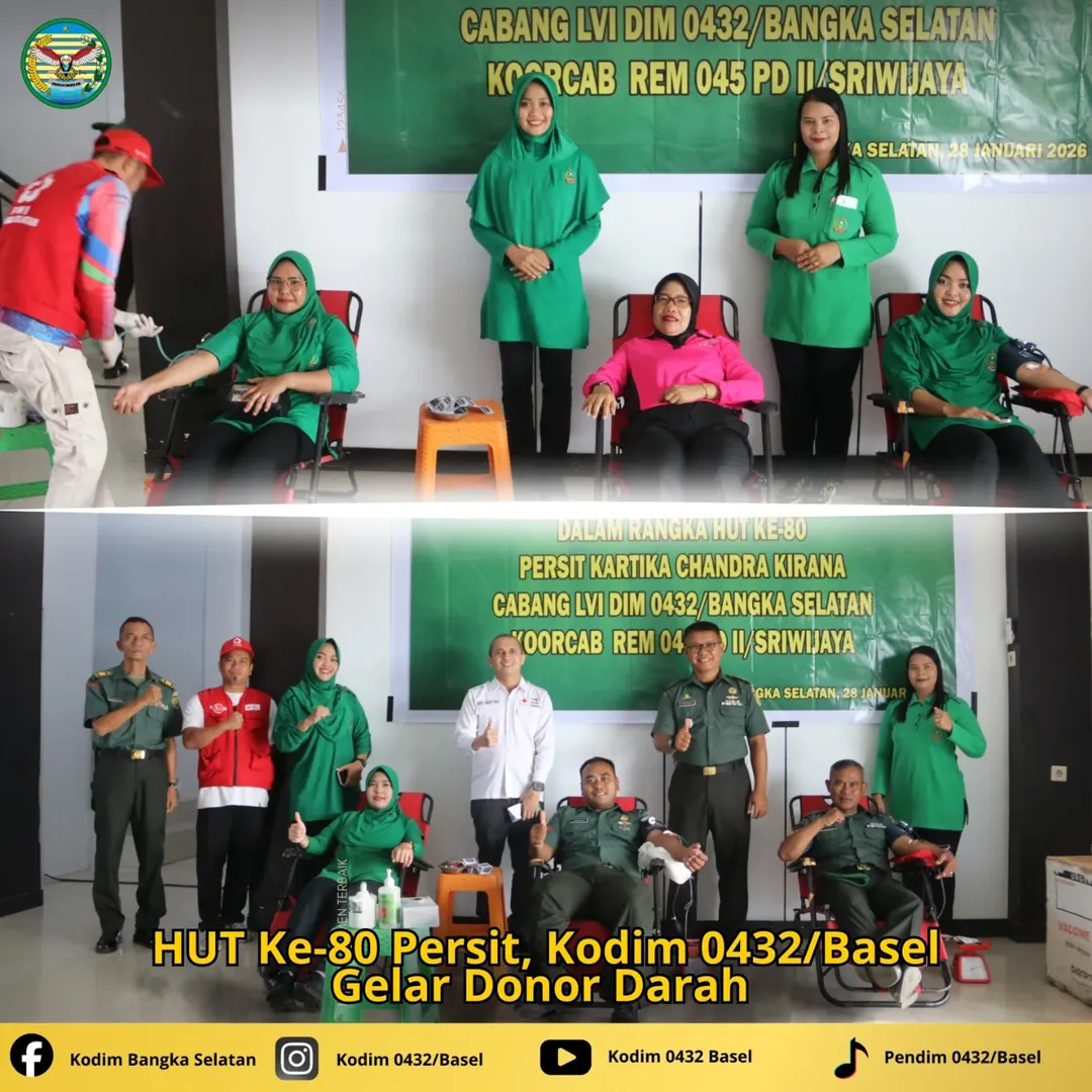 BANGKA SELATAN – Dalam rangka memperingati Hari Ulang Tahun (HUT) ke-80 Persit Kartika Chandra Kirana, organisasi wanita angkatan bersenjata Indonesia, Kodim 0432/Bangka Selatan menggelar kegiatan donor darah pada Selasa, 28 Januari 2026. Acara ini berlangsung di Markas Kodim 0432 yang terletak di Jalan Gadung Koba, Kecamatan Toboali, Kabupaten Bangka Selatan.