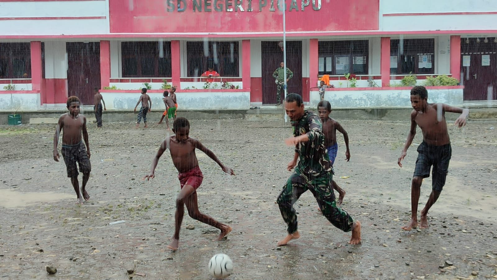 Cuaca hujan tak menyurutkan semangat personel Satgas TNI Manunggal Membangun Desa (TMMD) untuk menjalin keakraban dengan warga, terutama anak-anak di lokasi pelaksanaan TMMD. Meski diguyur hujan, tampak antusias bermain sepak bola bersama anak-anak desa. Kegiatan itu berlangsung di lapangan SD Pigapu, Distrik Iwaka. Kamis (29/5/2025)