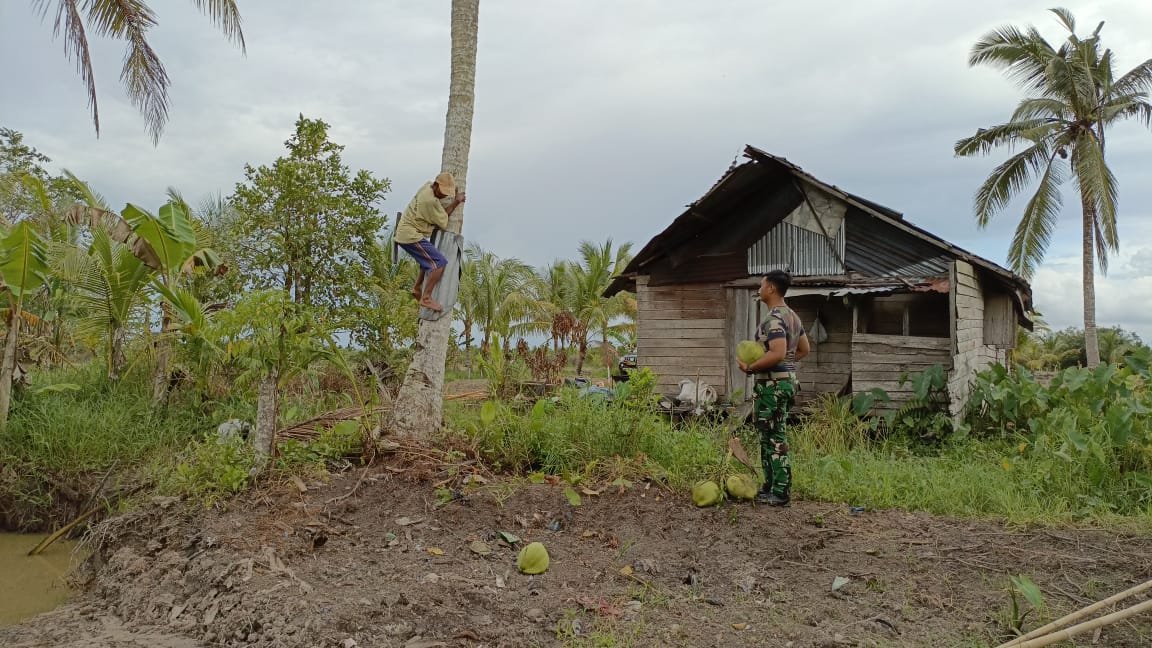 Personel Satgas TMMD Reguler ke-124 Membantu Warga Memanen Kelapa Muda