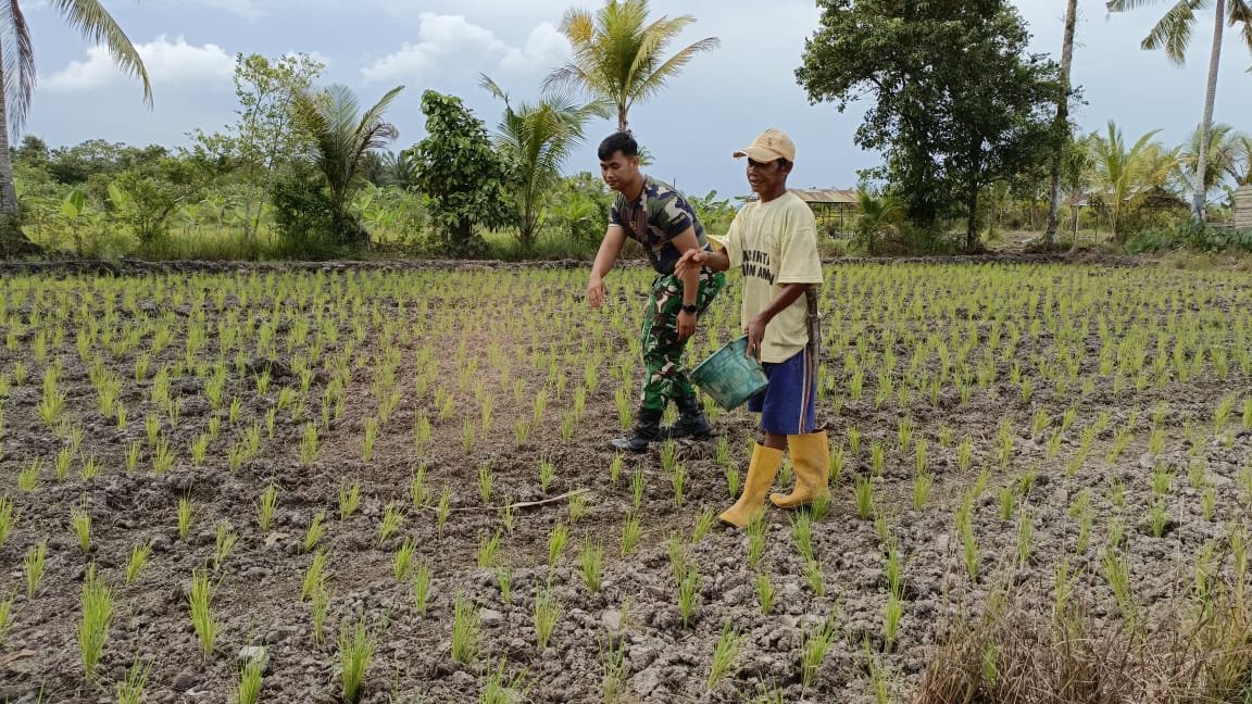 Personel Satgas TMMD Reguler ke-124 Membantu Warga Memupuk Tanaman Padi