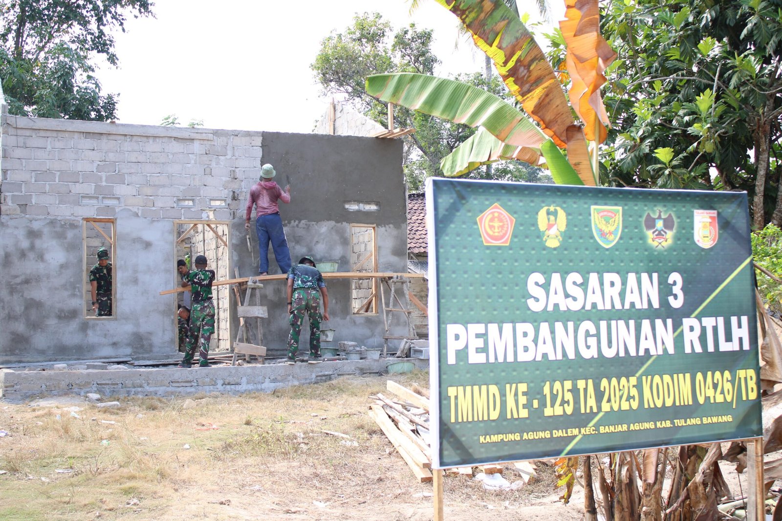 Tulang Bawang, 4 Agustus 2025 — Progres pembangunan Rumah Tidak Layak Huni (RTLH) Sasaran 3 dalam program TMMD ke-125 Kodim 0426/Tulang Bawang terus berlanjut. Kali ini, rumah bantuan yang berlokasi di Kampung Agung Dalam, Kecamatan Banjar Margo, mulai memasuki tahapan plesteran dinding.
