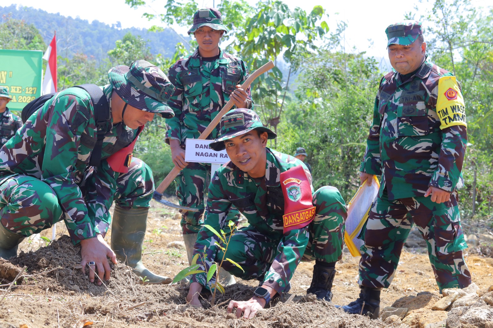 Dalam kegiatan itu, para prajurit bersama masyarakat menanam bibit pohon di sekitar lokasi program TMMD. Tanah digali secara bergantian, lalu bibit pohon ditempatkan dengan hati-hati sebelum ditimbun kembali.