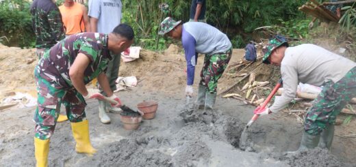 Anggota Satgas TMMD dan masyarakat setempat terlihat saling bahu-membahu dalam menyelesaikan pekerjaan dasar bangunan yang menjadi pondasi utama sebelum melanjutkan ke tahap pembangunan selanjutnya.