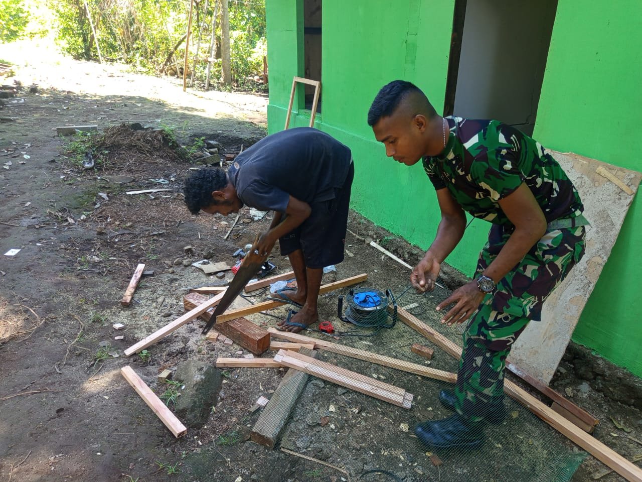Florianus yang sudah tak sabar untuk menghuni rumah barunya terus mendampingi dan membantu personel Satgas melakukan pengecatan.